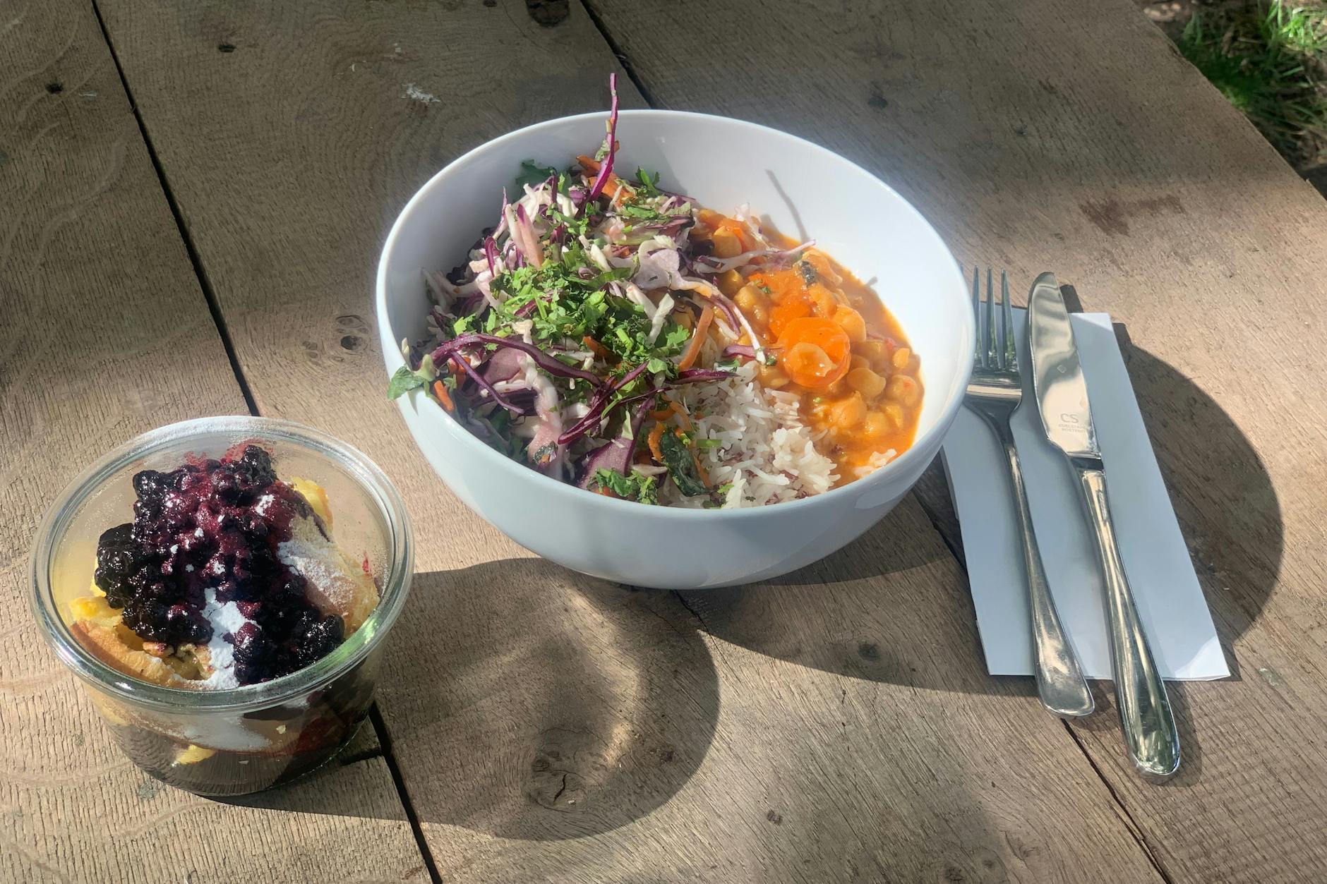 „Spreemittag“, so nennen die beiden Betreiber Grazyna Bukowa und Max Frey ihr täglich frisch gekochtes Mittagsmenü zum Mitnehmen. Heute gibt es ein Kartoffelgratin mit Parmesankruste und einem grünen Salatmix sowie selbstgebackenen Apfel-Streuselkuchen – für zehn Euro das Ganze. Wer sicher gehen will, etwas zu bekommen, bestellt vorher telefonisch oder im Netz. Sonst einfach hingehen und anstellen.