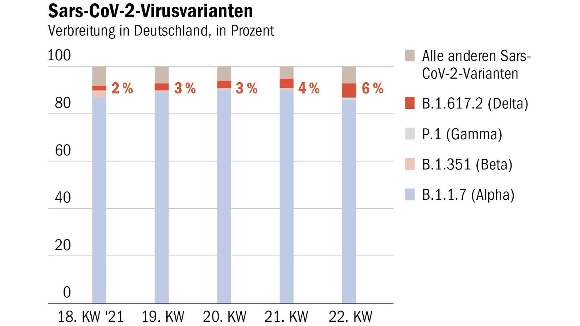 In Deutschland wiederum lag deren Anteil längere Zeit nur bei etwa zwei Prozent in den untersuchten Proben. Im jüngsten Bericht des Robert-Koch-Instituts (RKI) vom 16. Juni liegt er schon bei 6,2 Prozent. Auch hier gibt es die ersten Delta- Hotspots. Bis zum Herbst werde die Variante auch in Deutschland dominieren, erwarten Virologen. Doch wie besorgniserregend ist das überhaupt?