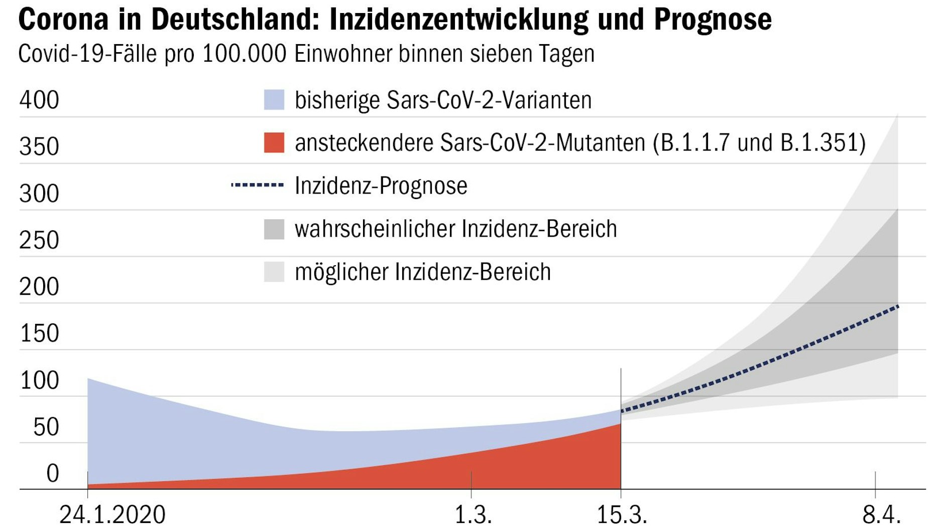 Demnach sind noch vor Ostern, am 1. April, Inzidenzen von 120 und 200 Fällen pro 100.000 Einwohner recht wahrscheinlich. Bis Mitte April könnte die Lage in Deutschland so ähnlich sein wie in der bisher schlimmsten Phase um Weihnachten, als die Sieben-Tage-Inzidenz knapp unter 200 lag.