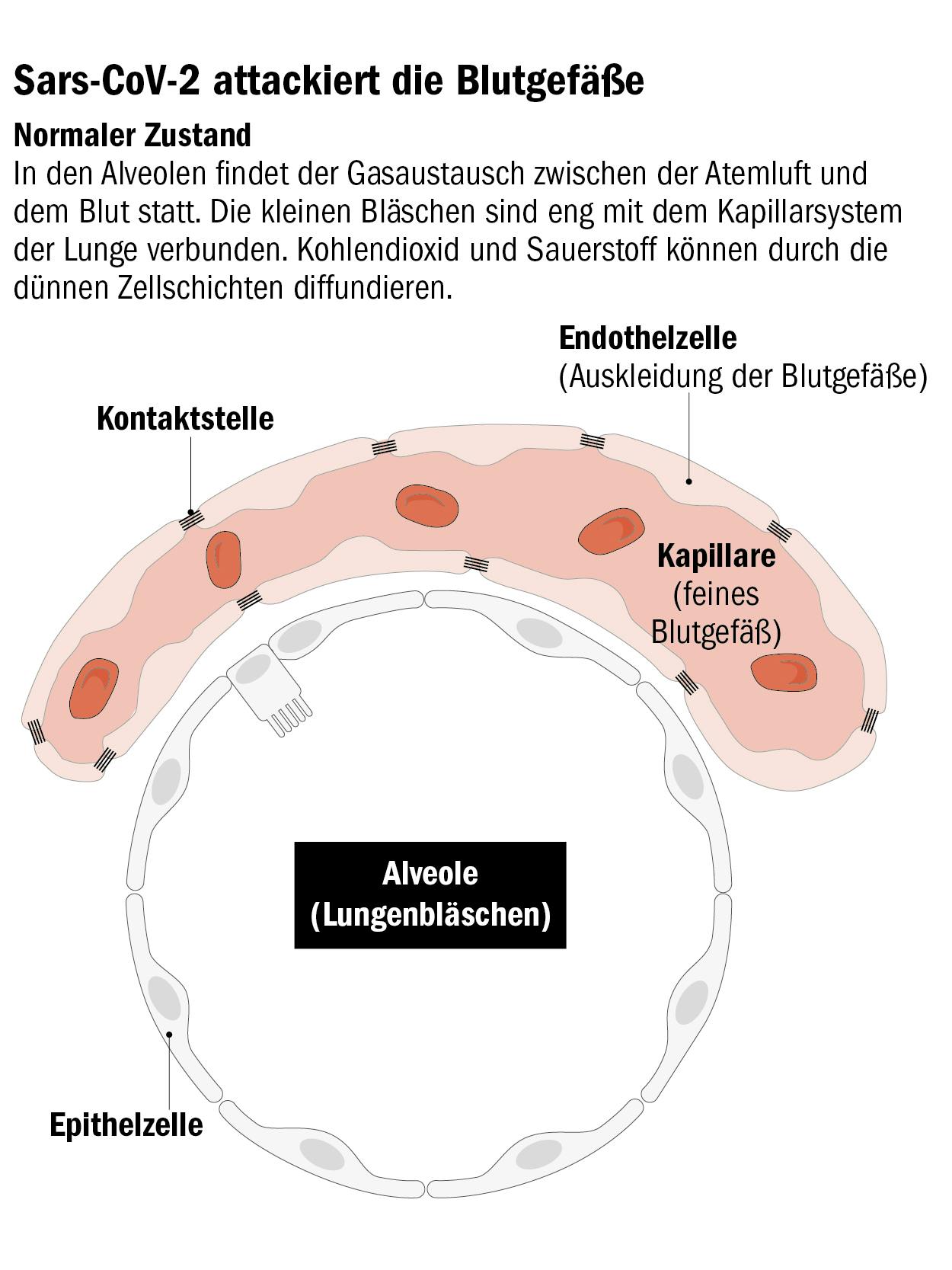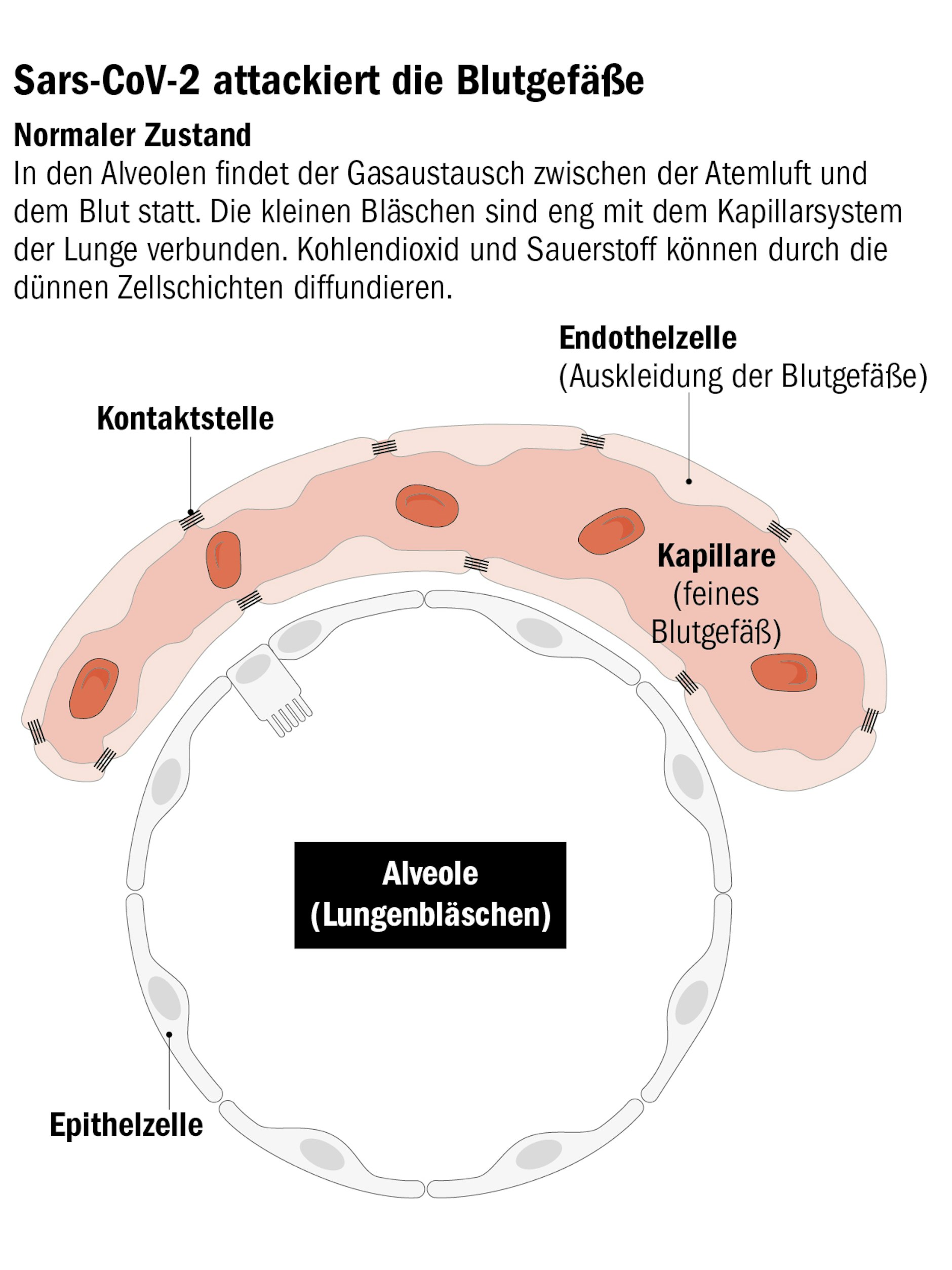 Neben einer nachhaltigen Schwächung des Immunsystems befürchten Falk und Brinkmann vor allem, dass noch weitere Organe des Körpers durch das Coronavirus beeinträchtigt werden. Denn hinter den Lungenbläschen sitzen, nur durch eine ganz dünne Zellschicht von den Alveolen abgegrenzt, die feinen Blutgefäße. „Wird diese Schicht durch die Infektion und die dadurch ausgelöste Entzündung zerstört, gelangt der Erreger womöglich ins Blut“, sagt Falk. Über den Blutstrom, vielleicht versteckt in den dort zirkulierenden Immunzellen, kann er dann andere Organe befallen, deren Zellen auf ihrer Oberfläche den ACE2-Rezeptor aufweisen.