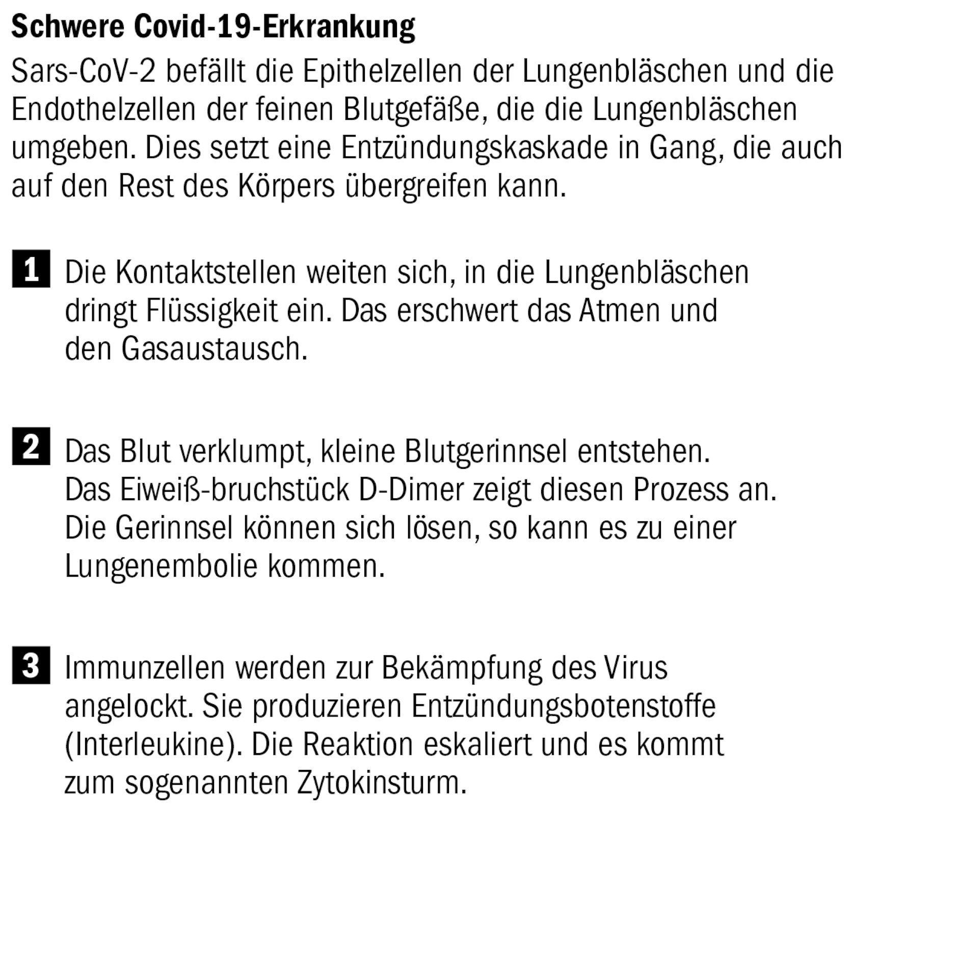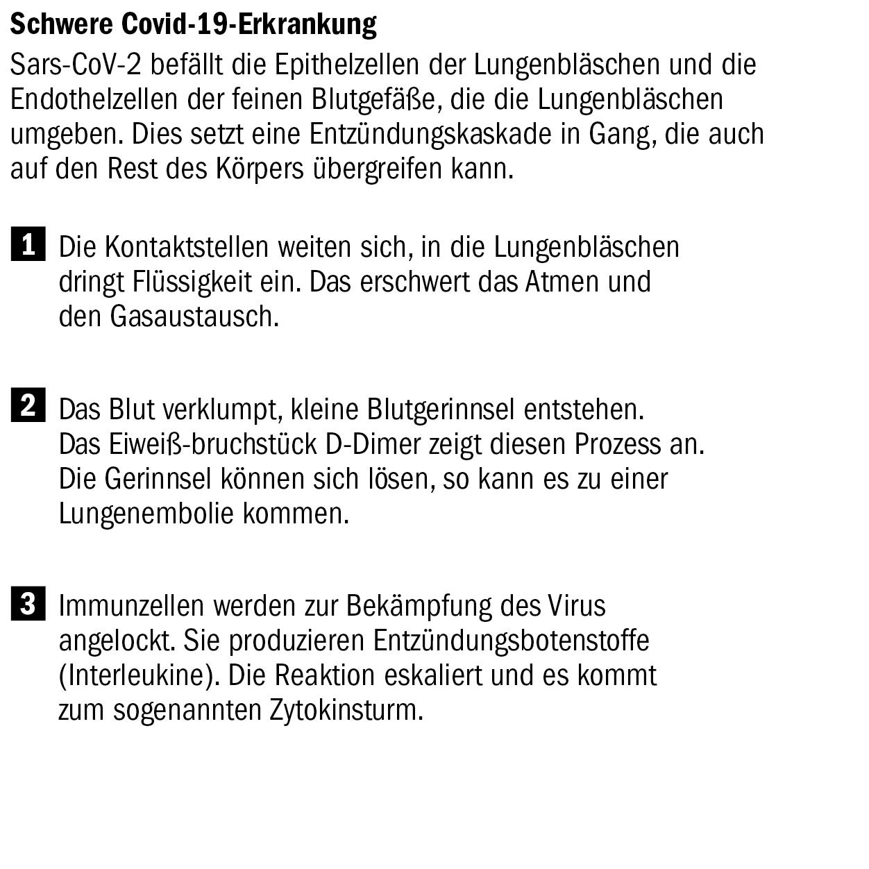 Ohnehin scheint die Körperabwehr nach einer schweren Covid-19-Erkrankung nicht mehr ganz so reibungslos zu funktionieren wie vor der Infektion. „Wir wissen zum Beispiel, dass die Zahl bestimmter weißer Blutkörperchen, der Lymphozyten, die Krankheitserreger abwehren sollen, im Blut oft noch wochen- oder gar monatelang reduziert ist“, berichtet die Immunologin Falk. Das kenne man so von anderen Infektionen der Lunge nicht. „Die Patienten gelten als genesen, sind aber noch nicht wieder gesund“, so Falk. Es scheine, als ob das Coronavirus in dem komplizierten Uhrwerk der Körperabwehr ein paar der feinen Rädchen nachhaltig zerstöre – oder ihnen zumindest die eine oder andere Zacke abgebrochen habe.