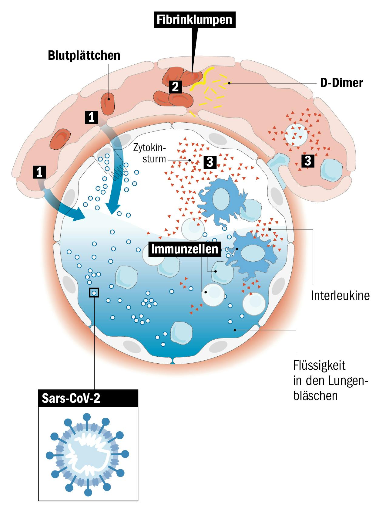 Das geronnene Blut ist nicht nur in der Lunge zu finden. „Studien haben gezeigt, dass 20 bis 30 Prozent der sehr schwer erkrankten Patienten Blutgerinnsel aufweisen, sowohl in der Lunge als auch in den Beinvenen“, berichtet die Virologin Melanie Brinkmann vom Helmholtz-Zentrum für Infektionsforschung in Braunschweig. Nachgewiesen werden die Thromben – die, wenn sie Richtung Lunge wandern und dort eine Embolie verursachen durchaus tödlich enden können – durch ein Eiweißbruchstück namens D-Dimer. Dieses wird gebildet, wenn sich das geronnene Blut wieder auflöst. „Ist der Wert stark erhöht, ist die Prognose der Patienten eher ungünstig“, erläutert Brinkmann.