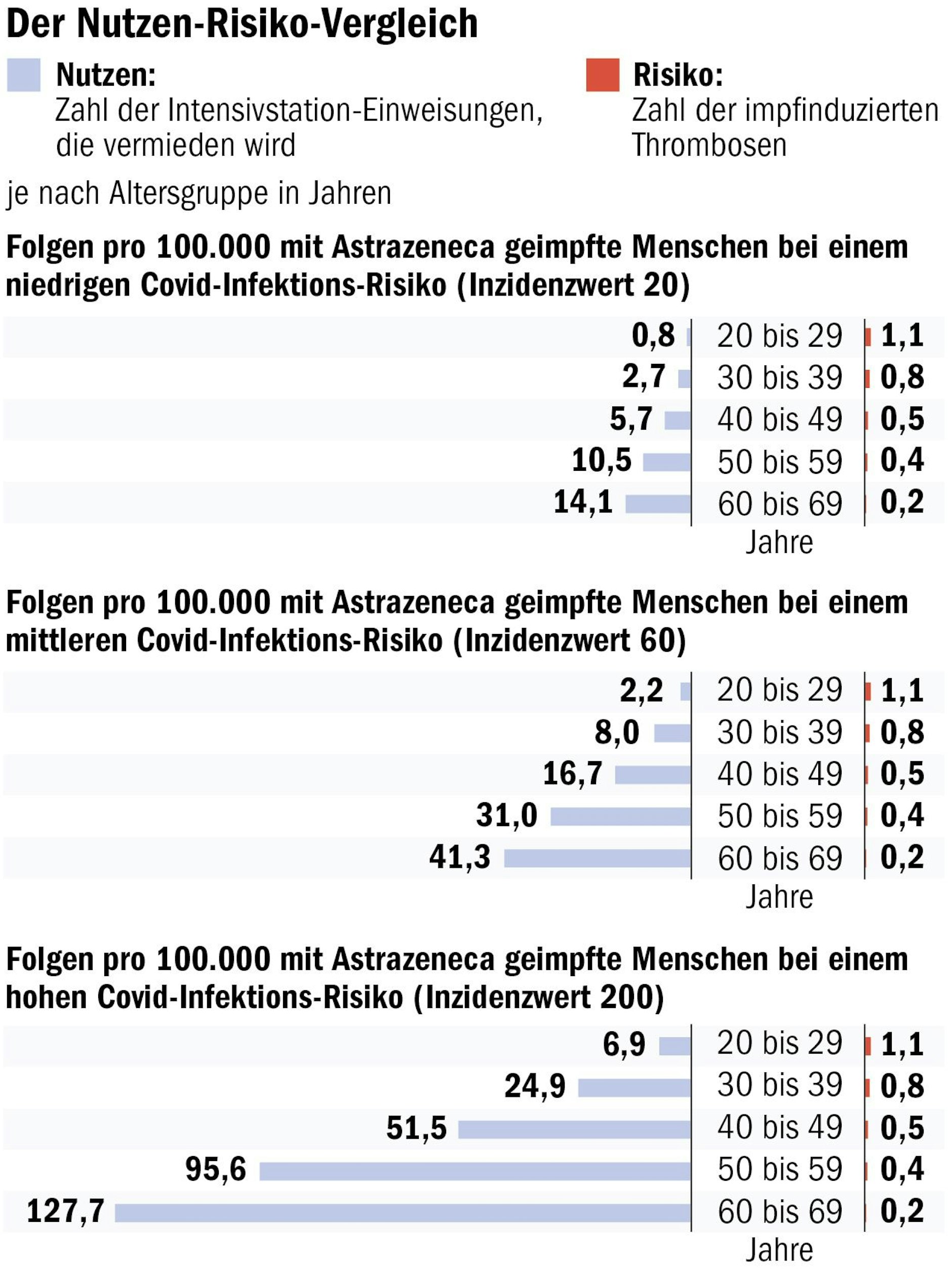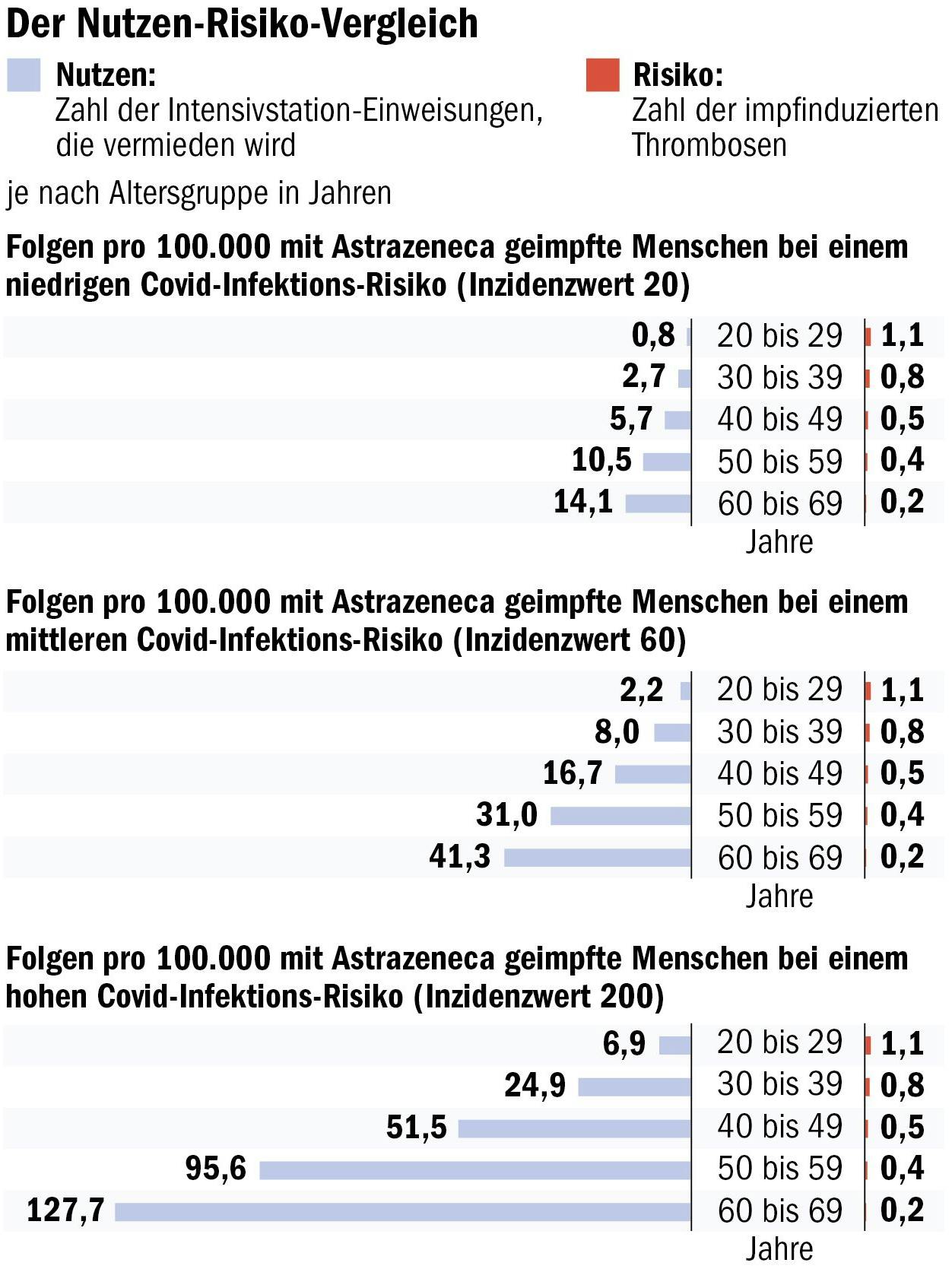 Die Altersgrenze von 60 Jahren wurde gewählt, weil die Thrombosen gehäuft bei Jüngeren auftraten und weil ab 60 die Gefahr, dass eine Covid-19-Infektion schwer oder gar tödlich verläuft, deutlich erhöht ist. Damit fällt die Nutzen-Risiko-Abwägung eindeutig zugunsten der Impfung aus. Denn mittlerweile steht fest, dass der Impfstoff vor allem vor schweren Verläufen sehr gut schützt.