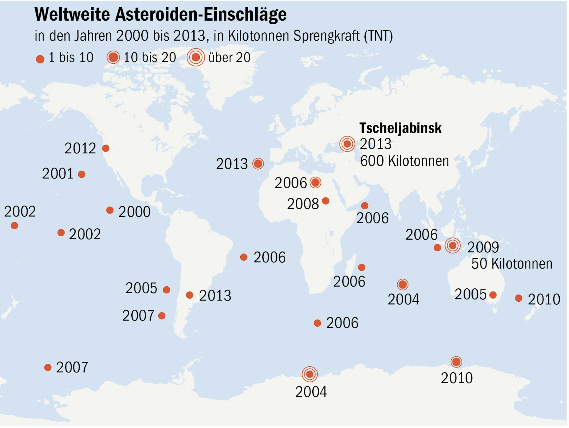Berlin-Es könnte jeden Tag passieren, so wie am 15. Februar 2013 in Tscheljabinsk, einer russischen Großstadt am Ural. Es war ein kalter Wintertag. Gegen 9.20 Uhr zog plötzlich ein Meteor seine Bahn über den blauen Himmel. Es gab einen Blitz, hell wie die Sonne, und einen gewaltigen Knall. In tausenden Gebäuden sprangen Türen auf, Fensterscheiben splitterten, Wände und Dächer wurden beschädigt, fast 1500 Menschen verletzt. Der Asteroid war nur etwa 20 Meter groß, wie ein Mietshaus. Er brach in etwa 30 Kilometern Höhe auseinander - mit einer Sprengkraft von 33 Hiroshima-Atombomben. Das Ereignis – genannt Airburst – ist auf vielen Videoaufnahmen zu sehen und zu hören.