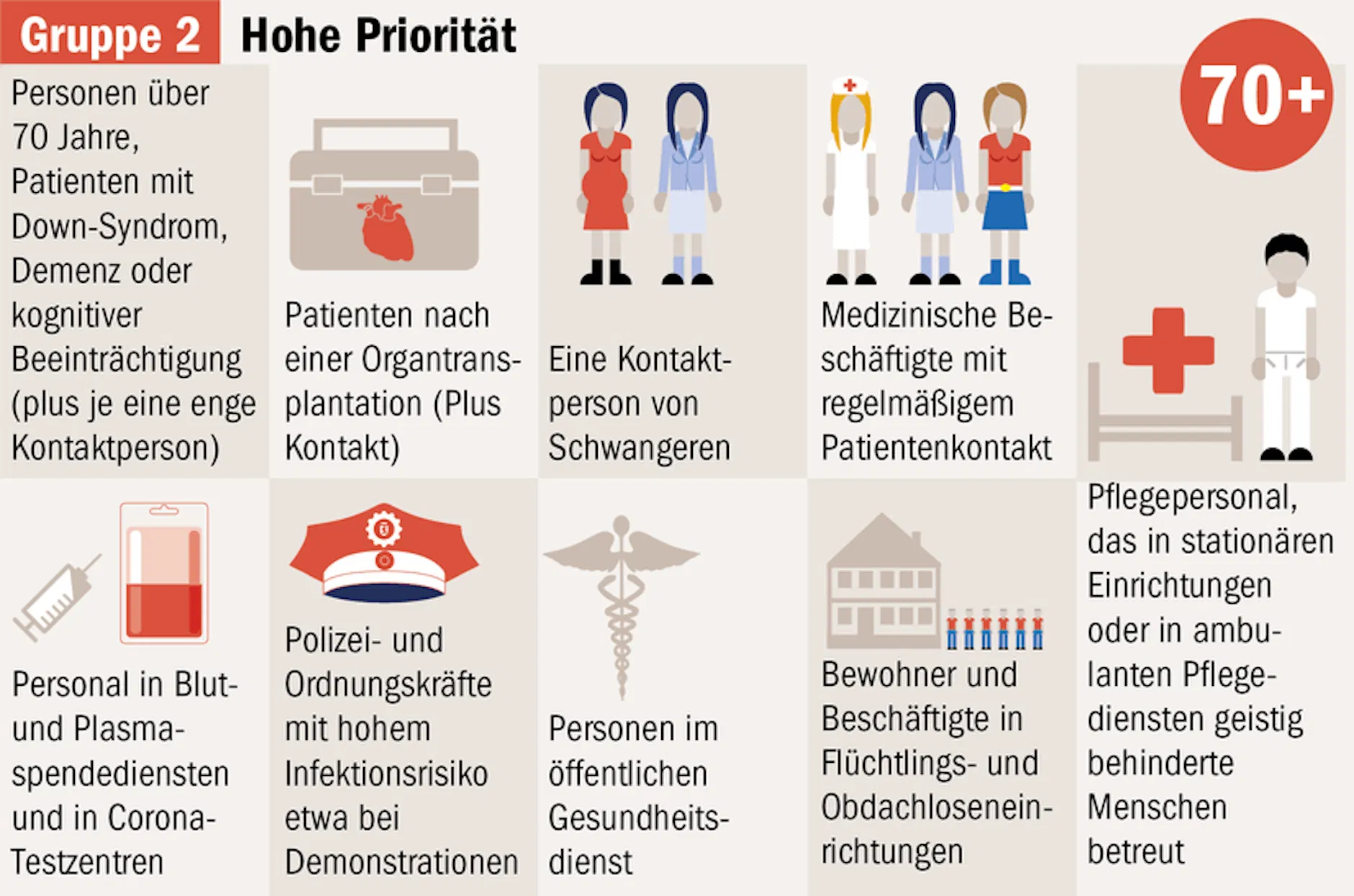 Außerdem: Personal in Blut- und Plasmaspendediensten und in Corona-Testzentren; Polizei- und Ordnungskräfte mit hohem Infektionsrisiko, zum Beispiel bei Demonstrationen; und Personen, die im öffentlichen Gesundheitsdienst oder in besonders relevanter Position zur Aufrechterhaltung der Krankenhausinfrastruktur tätig sind.