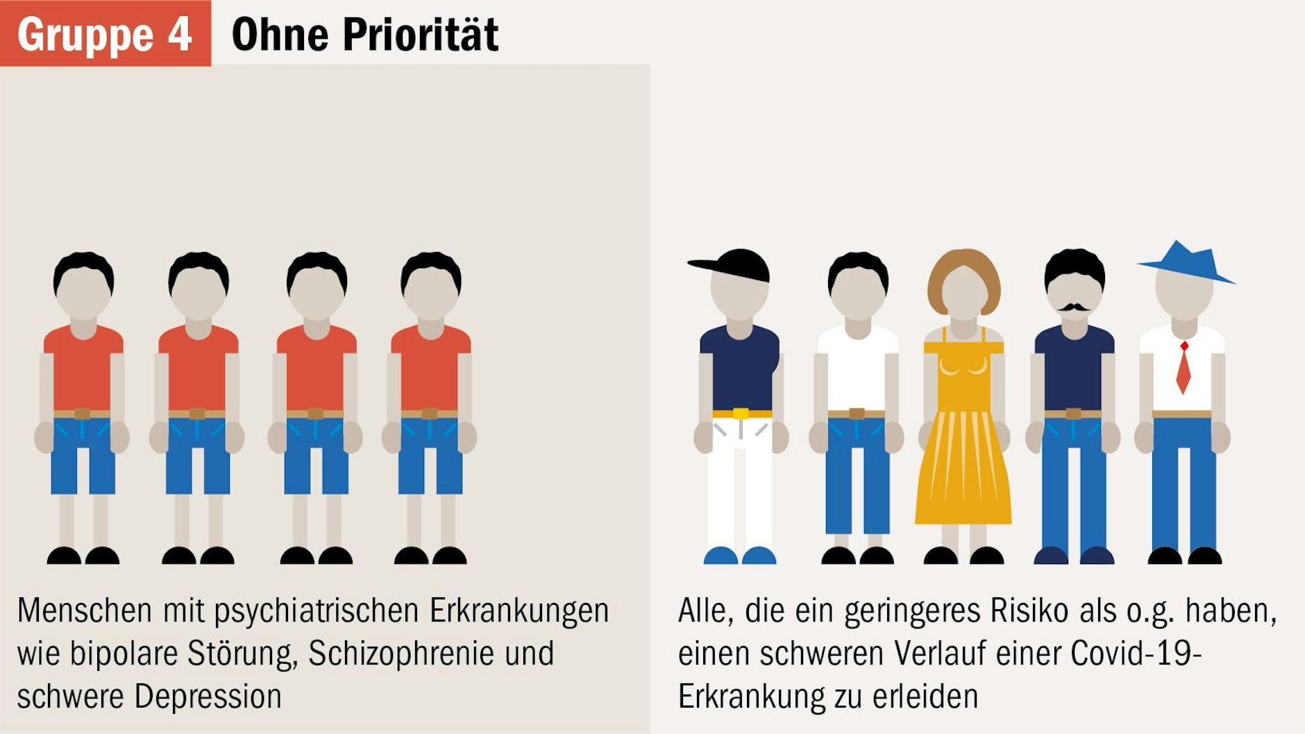 Die Gruppe 4 umfasst Menschen mit psychiatrischen Erkrankungen wie bipolare Störung, Schizophrenie und schwere Depression. Diese Personen haben laut Stiko häufiger einen schwereren Covid-19-Krankheitsverlauf und auch ein erhöhtes Risiko an Corona zu versterben. In der Stiko-Impfempfehlung werden sie zur Gruppe mit Menschen mit Vorerkrankungen gezählt, in der Impfverordnung des Bundesgesundheitsministeriums wurden sie allerdings nicht berücksichtigt und rutschen deshalb in die vierte Gruppe.