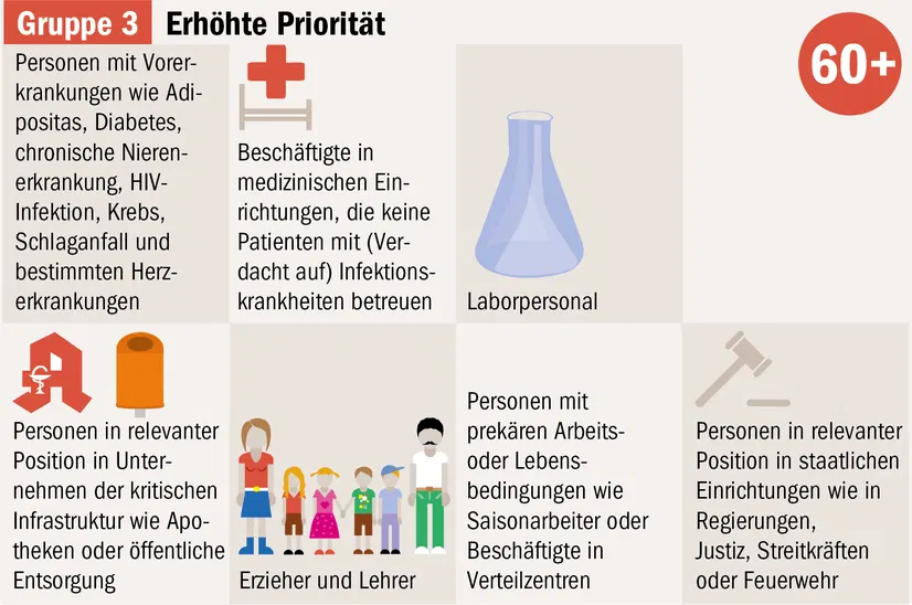 In der dritten Gruppe sind Menschen ab 60 Jahren an der Reihe. Außerdem sollen Personen mit folgenden Krankheiten geimpft werden: