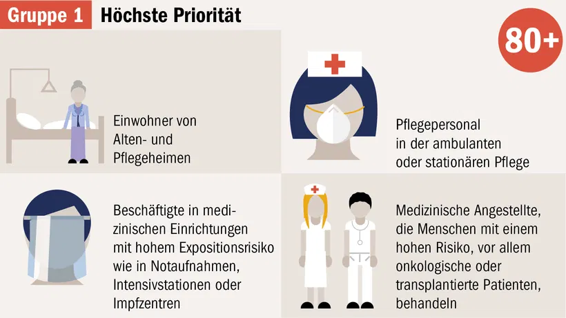 Zur ersten Gruppe gehören Menschen ab 80 Jahren sowie diejenigen, die in stationären Einrichtungen zur Behandlung, Betreuung oder Pflege älterer oder pflegebedürftiger Menschen betreut oder gepflegt werden oder tätig sind. Auch Personen, die im Rahmen ambulanter Pflegedienste ältere oder pflegebedürftige Menschen behandeln, gehören zur ersten Gruppe. Enge Kontaktpersonen von betagten oder pflegebedürftigen Menschen werden nicht geimpft.