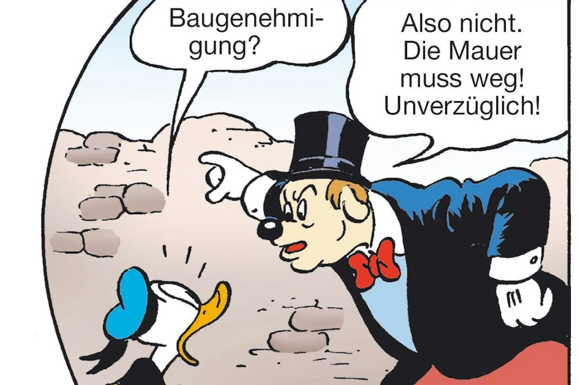 Der Grund, warum man sich in Entenhausen an den Mauerfall erinnert, ist Donald: Er will auch eine Mauer errichten, um sich von seinem nervigen Gartennachbarn abzugrenzen. Ein Bauamtsbeamter eilt herbei, der das Vorhaben mit dem berühmten Wort beendet, das vor 30 Jahren die Grenzen in Deutschland öffnete: Die Mauer müsse weg, sagt er und ergänzt wie einst SED-Funktionär Günter Schabowski: „Unverzüglich!“