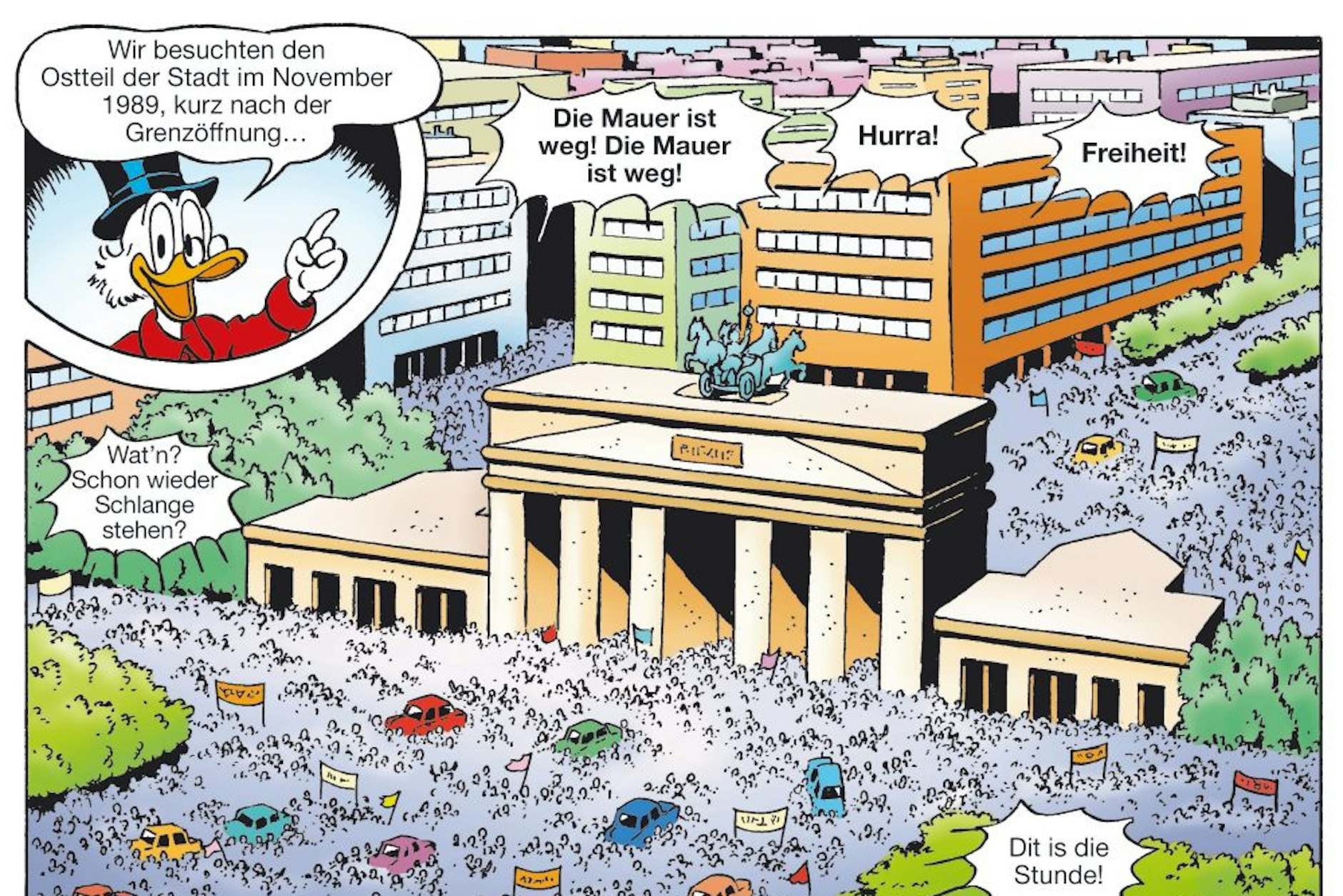 Dafür sorgt nun Onkel Dagobert, der sich in dem Comic auf insgesamt 45 Bildern an den Mauerfall erinnert. Wie er mit Donald Duck und dessen Neffen einen Tag danach Ost-Berlin besucht. Sie sind dabei, wie von allen Seiten die Menschenmassen zum Brandenburger Tor strömen und freudig rufen: „Die Mauer ist weg!“ Auf ihrer Autofahrt durch die Stadt treffen die Entenhausener immer wieder auf jubelnde Berliner: vorm Roten Rathaus, am Alliierten-Grenzübergang Checkpoint Charlie oder dem Palast der Republik. Vor dem Palast, der auch Sitz des DDR-Parlamentes, der Volkskammer, war, mutmaßen Donald Duck und seine Neffen, dass dort die Politiker mit dem Mauerfall „ein wenig überfordert sind“. Was sie in der Tat waren, wie man später aus Berichten der einstigen Abgeordneten erfuhr.