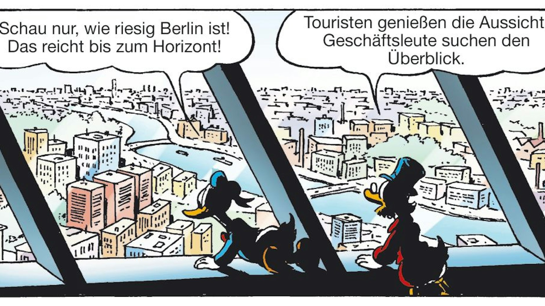 Bald stellt sich heraus, warum der als geldgierig bekannte Onkel Dagobert zum Mauerfall angereist ist. „Grenzenlose Geschäfte“, so der Comic-Titel, will er machen. Etwa den Fernsehturm durch einen neuen ersetzen. Doch Dagobert scheitert. Als er bei einem Spaziergang durch ein Wohnviertel erklärt, dass man aus den „baufälligen Häusern wahre Juwelen machen kann“, kontert ihm ein Ost-Berliner: „Billig koofen und teuer verkoofen? Kein Bedarf!“