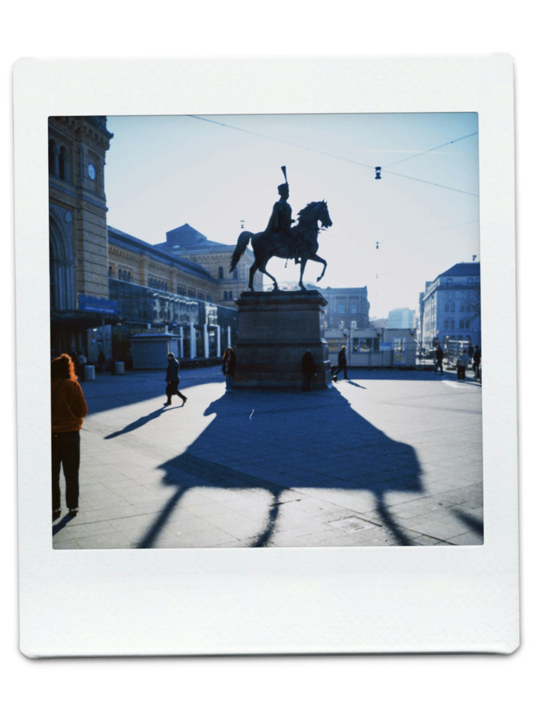 • 18.18 Uhr. Kurz vor dem Hauptbahnhof ein Highlight: Die Binnenalster, darüber hängt die Mondsichel in der Abenddämmerung. Hübsch. Hab Hunger. Und muss mal für kleine Wüstenwanderer. Also weiter.