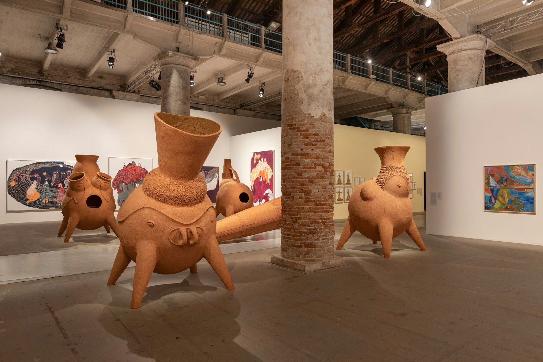 Sie zeigen gesichtslose, androgyne Figuren in mythischen Szenen. Die Kubanerin, die sich 1999 mit nur 32 Jahren das Leben nahm, erforschte und unterwanderte darin die afro-kubanische Bruderschaft von Abakua. Beeindruckende, überdimensionierte Tonofen-Skulpturen aus in der Sonne getrocknetem, roten Ton des Argentiniers Gabriel Chaile sind inspiriert von präkolumbianischer Kunst und porträtieren seine Familie. Flankiert werden sie von den mysteriösen Traummalereien von Portia Zvavahera.