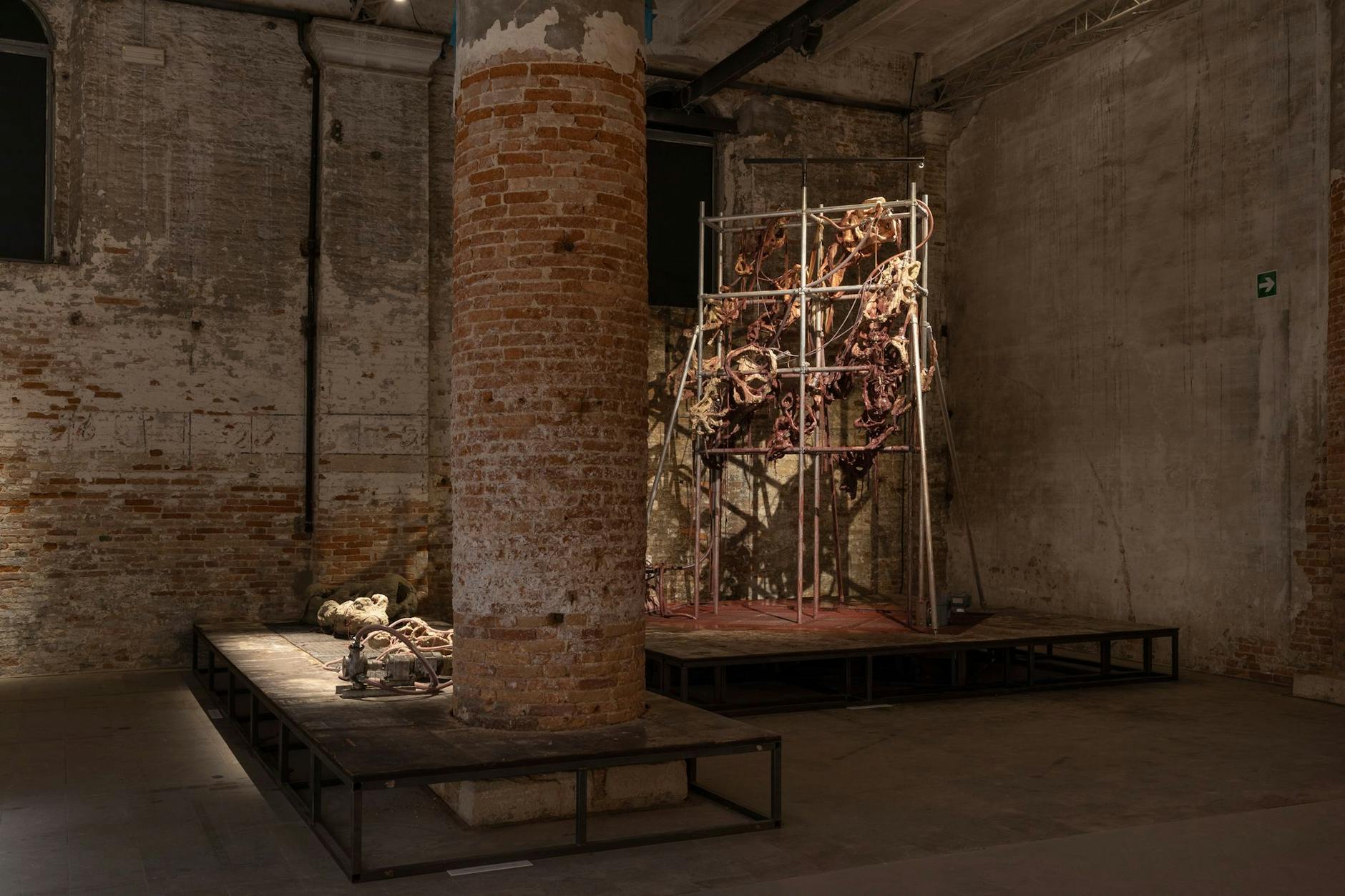 Carringtons jenseitige Wesen auf ihrer Reise durch die Metamorphosen von Körpern und Definitionen des Menschen zu folgen, manifestiert sich in einer Vielzahl großformatiger Werke, Installationen, Wandbilder und Skulpturen. Eine Skulptur steht da fast exemplarisch für diese Biennale ganz am Anfang der Ausstellung im Zentralpavillon in den Giardini.