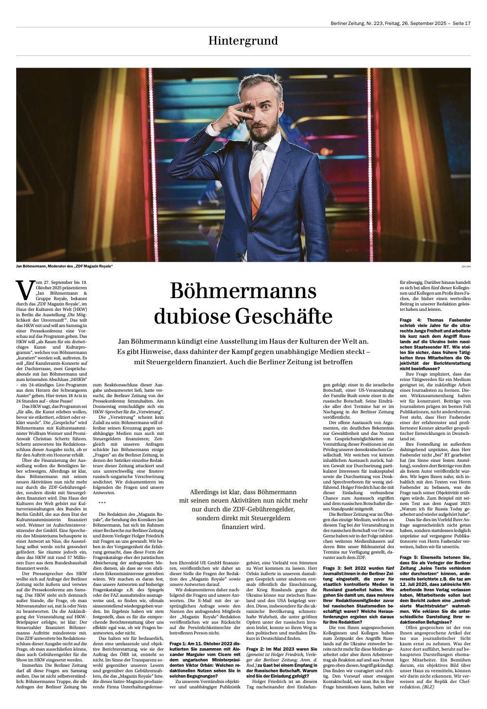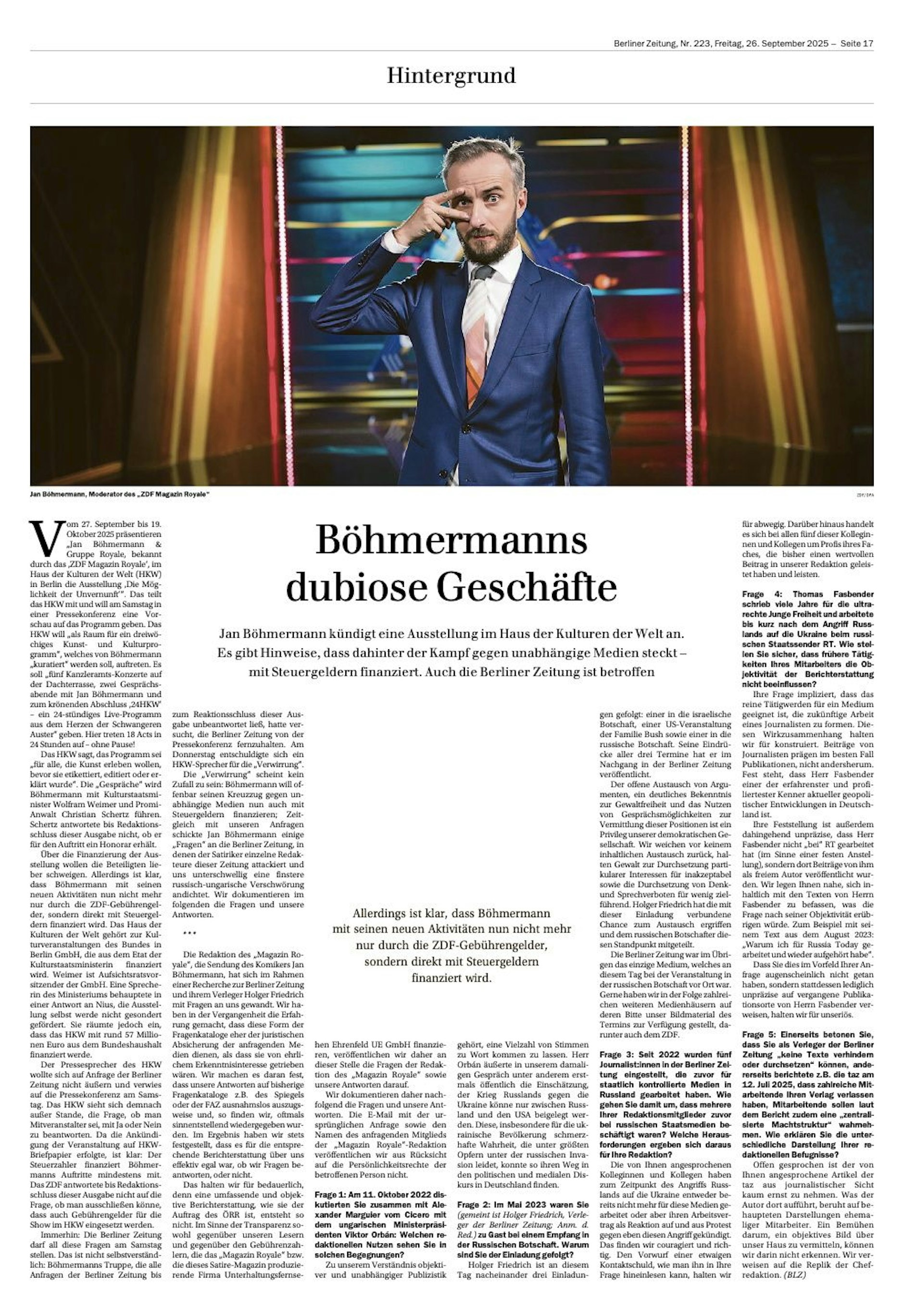 Über die Finanzierung der Ausstellung wollen die Beteiligten lieber schweigen. Allerdings ist klar, dass Böhmermann mit seinen neuen Aktivitäten nun nicht mehr nur durch die ZDF-Gebührengelder, sondern direkt mit Steuergeldern finanziert wird. Das Haus der Kulturen der Welt gehört zur Kulturveranstaltungen des Bundes in Berlin GmbH, die aus dem Etat des Kulturstaatsministers finanziert wird. Weimer ist Aufsichtsratsvorsitzender der GmbH. Eine Sprecherin des Ministeriums behauptete in einer Antwort an Nius, die Ausstellung selbst werde nicht gesondert gefördert. Sie räumte jedoch ein, dass das HKW mit rund 57 Millionen Euro aus dem Bundeshaushalt finanziert werde. Der Pressesprecher des HKW wollte sich auf Anfrage der Berliner Zeitung nicht äußern und verwies auf die Pressekonferenz am Samstag. Das HKW sieht sich demnach außer Stande, die Frage, ob man Mitveranstalter sei, mit Ja oder Nein zu beantworten. Da die Ankündigung der Veranstaltung auf HKW-Briefpapier erfolgte, ist klar: Der Steuerzahler finanziert Böhmermanns Auftritte mindestens mit. Das ZDF antworte bis Redaktionsschluss dieser Ausgabe nicht auf die Frage, ob man ausschließen könne, dass auch Gebührengelder für die Show im HKW eingesetzt werden. (Update Freitag, 26.9., 9:40 Uhr: Das ZDF schreibt: „Die von Ihnen angeführte Veranstaltung im Haus der Kulturen der Welt wird weder vom ZDF veranstaltet, noch sind wir in deren Abwicklung oder Finanzierung involviert.“)