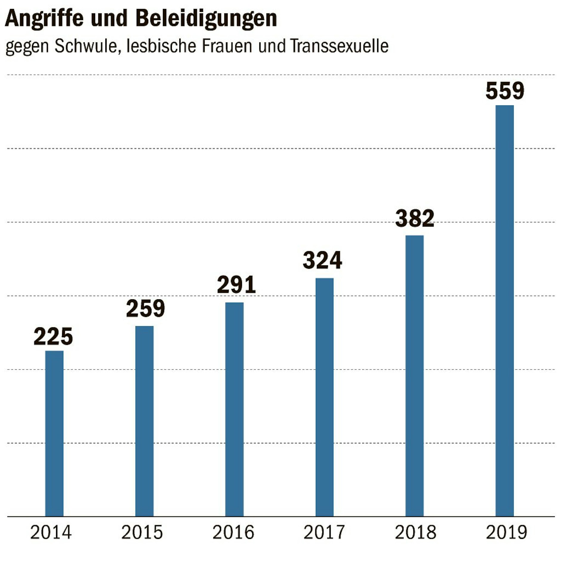 Berlin-Das Berliner Anti-Gewalt-Projekt Maneo hat im vergangenen Jahr so viele Angriffe und Beleidigungen gegen Schwule, lesbische Frauen und Transsexuelle gezählt wie nie zuvor. 559 Fälle wurden in der Jahresstatistik 2019 registriert - ein Anstieg von 32 Prozent im Vergleich zum Vorjahr, wie Maneo am Freitag mitteilte. Im Jahr 2018 waren 382 Übergriffe erfasst worden. In den meisten Fällen waren 2019 Schwule und männliche Bisexuelle betroffen (395 Fälle).