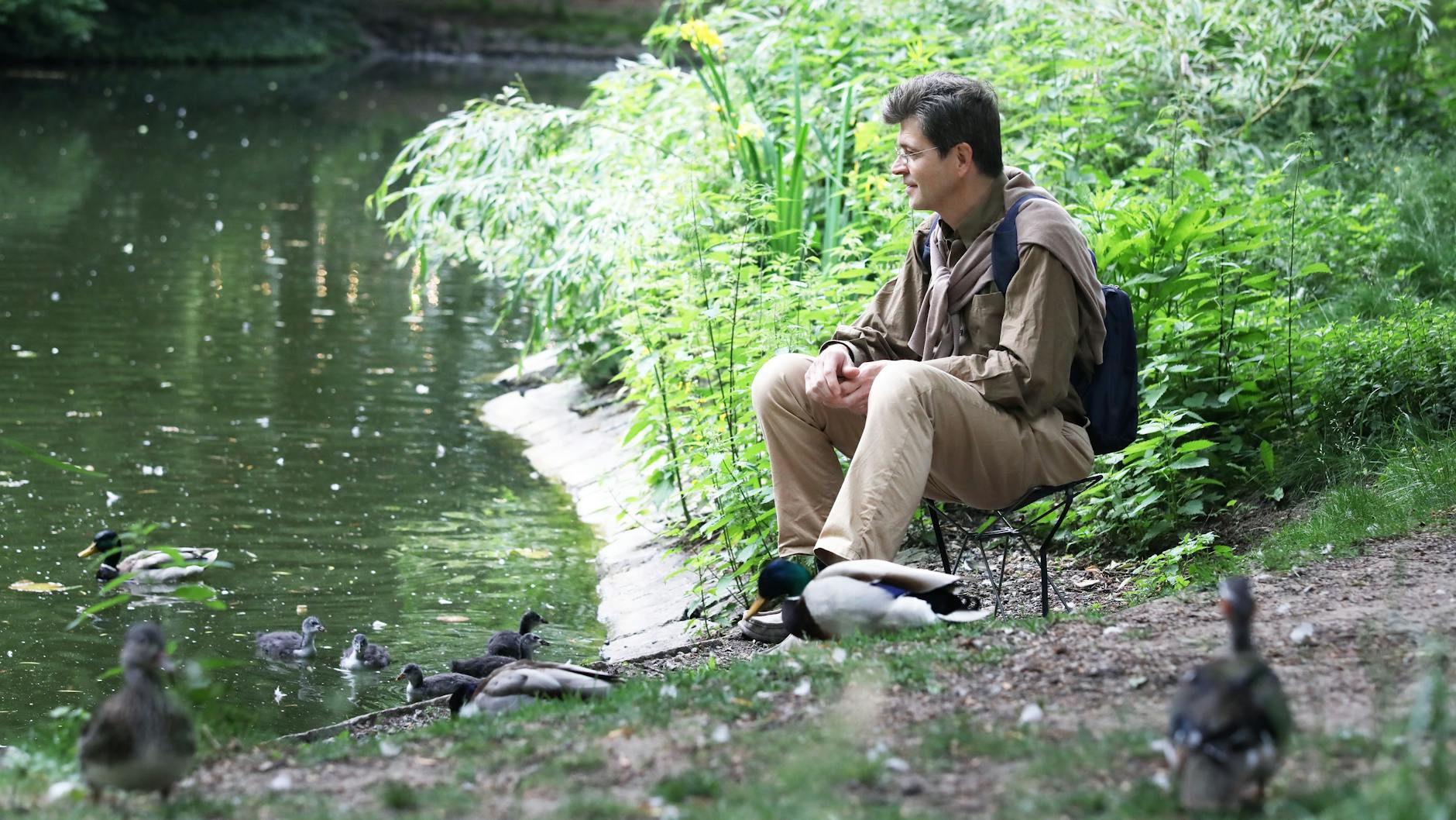 Erst später begann er, sich intensiver mit den Enten zu beschäftigen. Der Knoten sei geplatzt, als die erste „Enten-Freundschaft“ entstand, erzählt er. „Es war ein heißer Tag, ich saß am Wasser“, sagt er. Eine der Enten, die er am Tag zuvor beobachtet hatte, schwamm zu ihm, ließ sich am Ufer neben ihm nieder. Sie schmiegte sich mit dem nassen Gefieder an sein Bein. „Diesen Moment, dieses vertrauensvolle Gefühl wollte ich immer wieder erleben.“