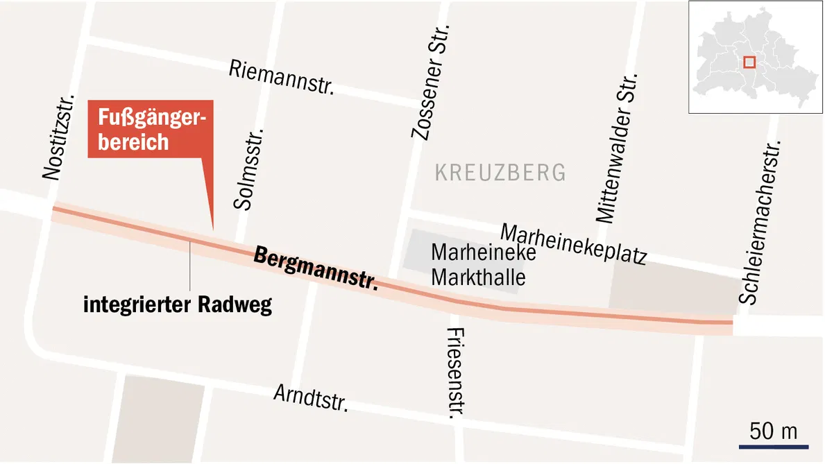 Einbahnstraßenregelungen und Tempo-20-Bereiche sollen im gesamten Viertel den Verkehr beruhigen, hieß es. Die Sperrung der Bergmannstraße für Autos wird ein zentrales Vorhaben sein. Lieferverkehr ist dort nur noch zwischen 6 und 11 Uhr erlaubt. Für die Gestaltung der neuen Fußgängerzone, die mit einem Radweg versehen wird, will das Bezirksamt einen städtbaulichen Wettbewerb ausschreiben. „Ein wichtiges Element der Gestaltung soll dabei Infrastruktur sein, die Grünflächen und Wasserelemente strategisch miteinander verbinden und dadurch Regenwasser filtert, die Temperatur lokal regelt und Lebensräume für Insekten bietet“, so die Pressemitteilung.