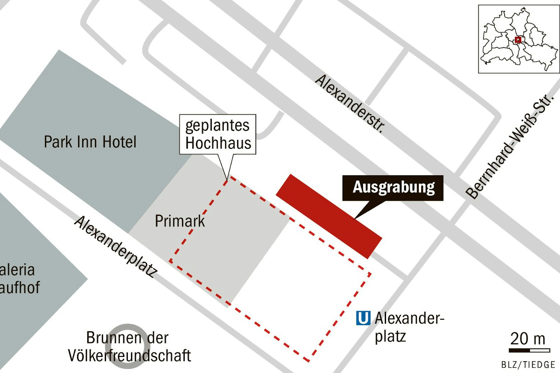 Als die Archäologen um Torsten Dressler Ende September 2019 neue Grabungen zwischen Park Inn Hotel und Alexanderstraße begannen, wussten sie ungefähr, was sie erwartete. Doch Neuigkeiten und Überraschungen gibt es immer wieder – selbst im Untergrund des im Laufe der vergangenen zwei Jahrhunderte immer wieder umgewühlten und umgebauten Alexanderplatzes. Vor allem die Zerstörungen des Zweiten Weltkrieges und die folgenden groben Eingriffe durch die DDR-Bauplaner haben das Gesicht des Ortes bis zur Unkenntlichkeit zerstört. Keine Spur mehr von der Alten Schützenstraße oder jenem Teil der Keibelstraße, der sie kreuzte. Will man sich ein Bild verschaffen von der Lage zu Zeiten der wachsenden preußischen Königsstadt vor dem Königstor, wie es nach 1701 hieß, müssen alte Karten her und der Blick in den Untergrund.