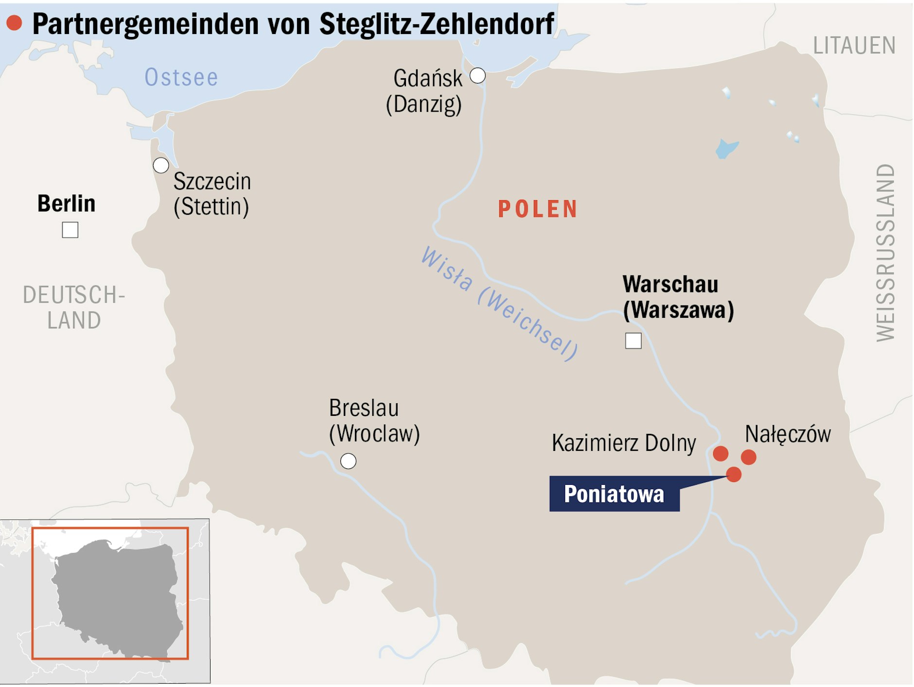 Zu der Geschichte gehört auch, dass Poniatowa nicht Steglitz-Zehlendorfs einzige Partnergemeinde in Polen ist. Es war die Musikschule Steglitz, die Anfang der 90er-Jahre Kontakte zur Musikschule von Poniatowa knüpfte. Das Bezirksamt initiierte eine förmliche Partnerschaft, stellte aber bald fest, dass der Partner doch arg klein ist. Schließlich schlossen sich die benachbarten Städte Kazimierz Dolny und Naleczów dem Vorbild Poniatowas und erklärten sich ebenfalls zu Partnern des Bezirks in Berlins Südwesten.