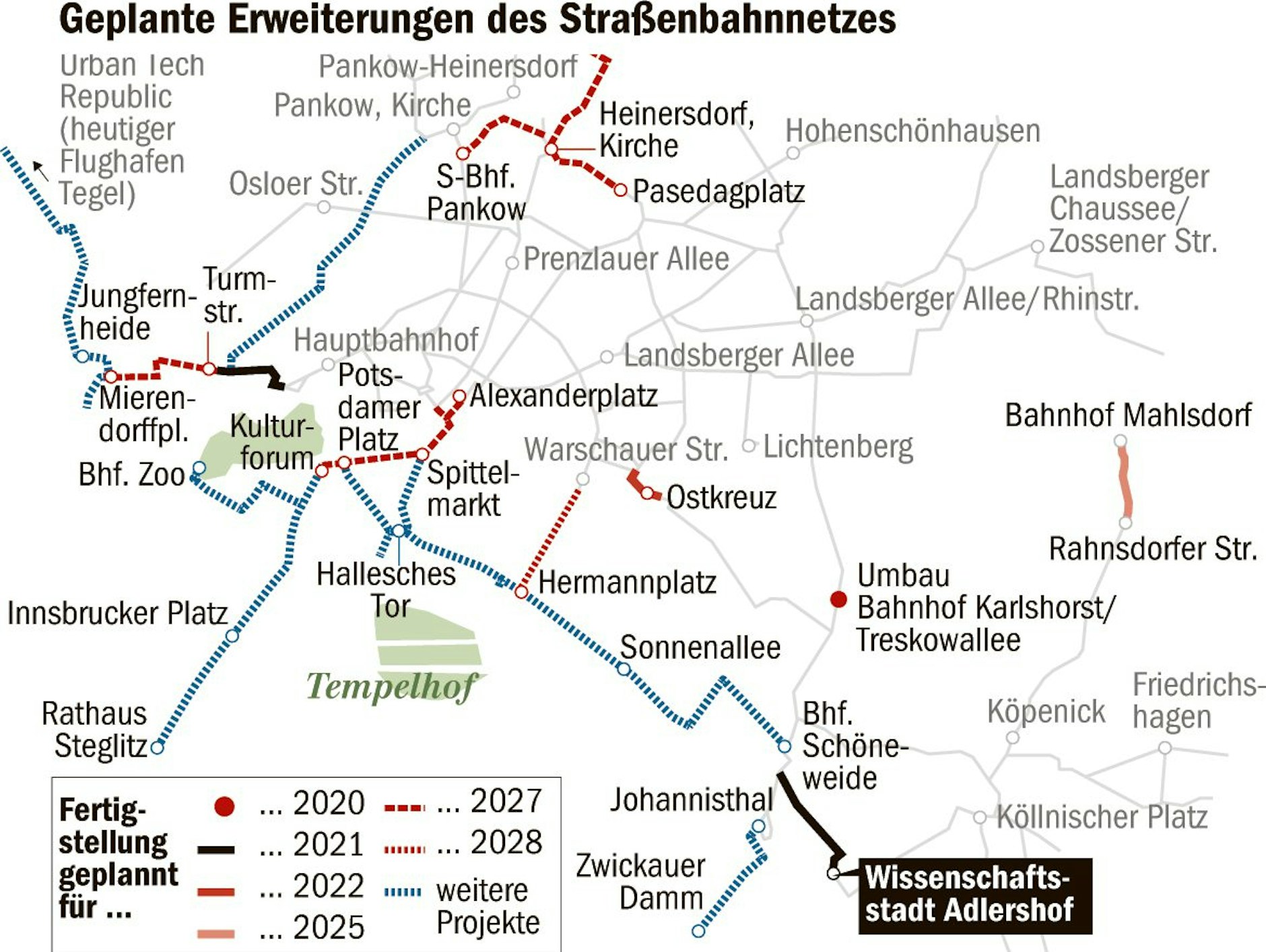 Der Streckenbau am Groß-Berliner Damm sollte ursprünglich schon 2015 beginnen. Auch die jetzige Strecke in die Wissenschaftsstadt hatte Verspätung. Anfangs sollte sie 1999 eröffnet werden. Aber dann stoppte der damalige Stadtentwicklungssenator 2001 Peter Strieder (SPD) das Projekt – es werde nicht gebraucht, gab er zu bedenken. Erst 2007 ging der Bau los, vier Jahre später rollte die erste Straßenbahn über die Rudower Chaussee.