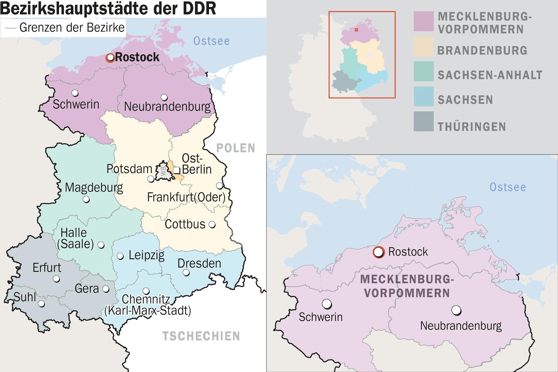 In der DDR war sie gewachsen und gewachsen, vor allem, nachdem sie 1952 Bezirksstadt geworden war. Der Ostseebezirk, der von hier aus verwaltet wurde, erstreckte sich über die gesamte Küste der DDR. In der Stadt Rostock zogen das Dieselmotorenwerk, das Fischkombinat, der neue Überseehafen, in einem Sumpfgebiet errichtet, junge Leute an. In neun neuen Großsiedlungen entstanden mehr als 50.000 Wohnungen für die neuen Rostocker und ihre Kinder, dazu Kindergärten, Schulen, Kaufhallen. 1971 hatte Rostock mehr als 200.000 Einwohner, mehr als doppelt so viele wie nach Ende des Zweiten Weltkriegs, 1988 waren es schon 254.000.