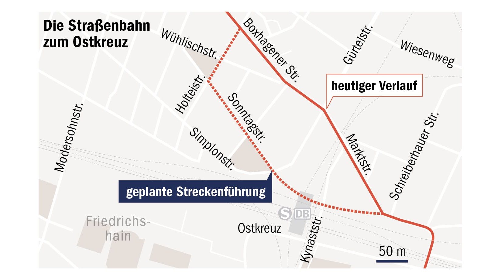 Heute fährt die Bahn durch die Boxhagener Straße. Doch dort sollen laut Senat die Gleise verschwinden – um Platz für die Autolawine zu schaffen, die nach Freigabe der Autobahn A100 nach Treptow in das Viertel hineindrängen wird, wie Hans-Hermann David vermutet. Die jetzige Strecke müsse bleiben, sagt er. Von der Marktstraße, unweit der Jugendherberge, wäre es nur ein kurzer Fußweg zum Ostkreuz. „Ein anderer Vorschlag wäre, unter der Ringbahnbrücke einen Kopfbahnhof zu bauen.“ Die Straßenbahnen würden am Victoria-Center auf einer Stichstrecke hineinfahren – und auf demselben Weg wieder hinaus.
