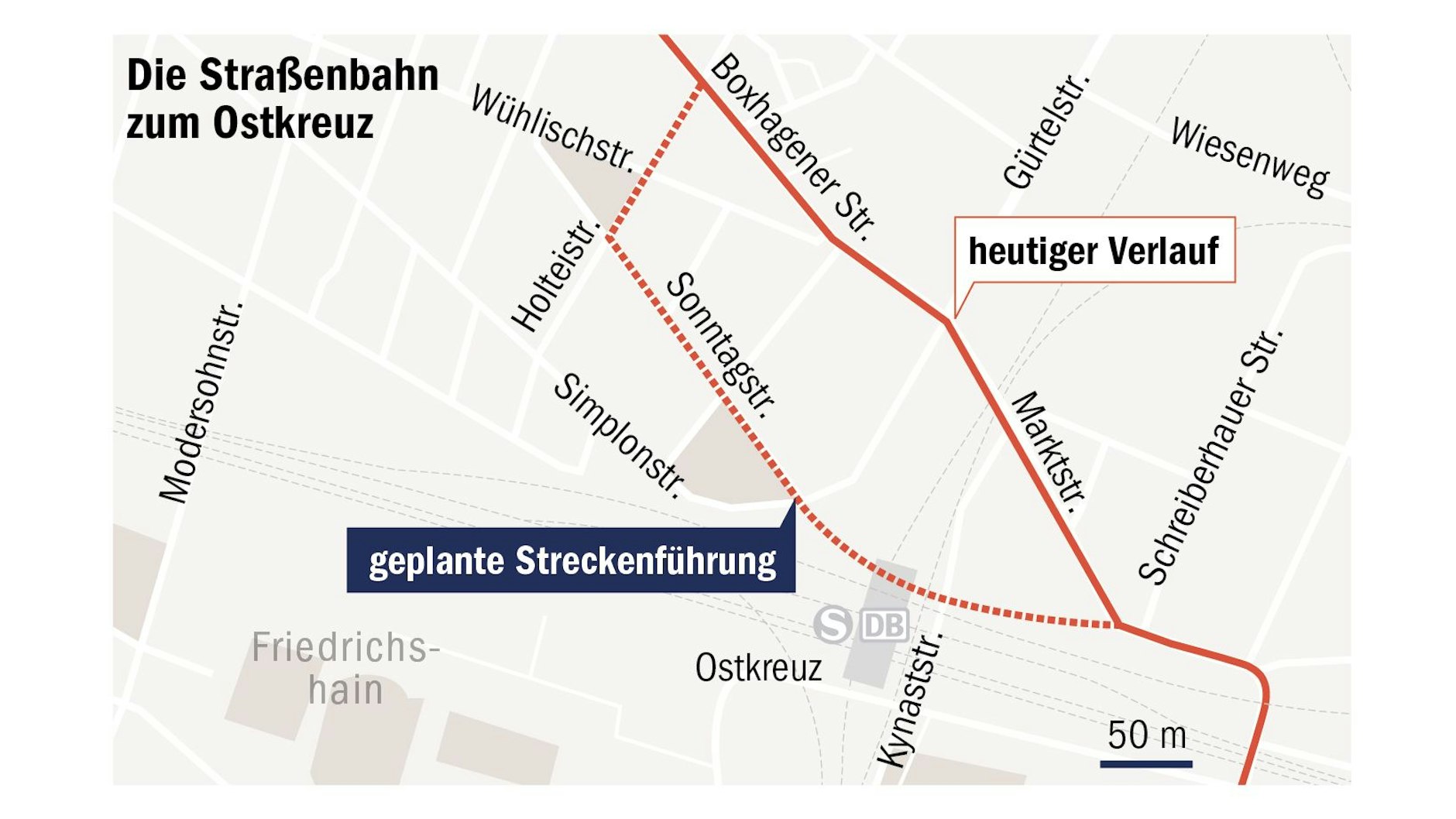 „Für die direkte Streckenführung aus Friedrichshain und aus Lichtenberg/Rummelsburg sprechen insbesondere die kurzen Umsteigewege, die den Nahverkehr hier besonders attraktiv machen“, bekräftigte Jan Thomsen, Sprecher von Verkehrssenatorin Regine Günther (Grüne). „Die direkte Anbindung umliegender Wohngebiete in Friedrichshain-Kreuzberg und Lichtenberg stärkt die – ohnehin große – Bedeutung des Bahnhofs Ostkreuz für den öffentlichen Nahveerkehr insgesamt. Der Halt am Ostkreuz ist direkt unter der Ringbahn geplant und verbessert so die Erreichbarkeit des Bahnhofs entscheidend.“
