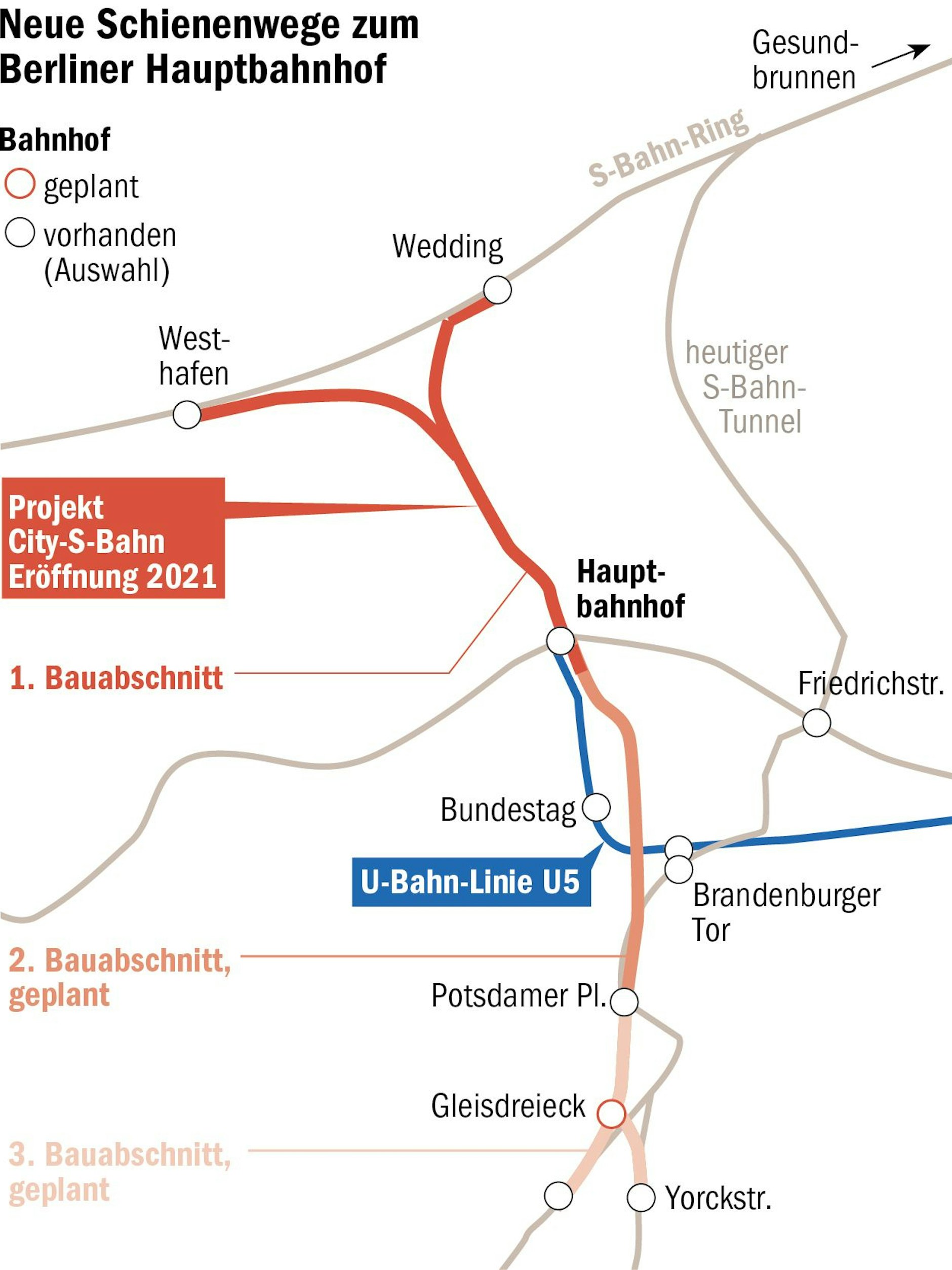 Die Strecke wird nicht nur am Sitz des Bundestags, sondern auch an der US-Botschaft vorbeiführen. Vielerorts sind andere unterirdische Bauwerke im Weg. Und so wird die City-S-Bahn dort zu einer kurvigen Berg-und-Tal-Bahn werden. Vor dem Brandenburger Tor wird eine Baugrube klaffen. Um den Anschluss an den jetzigen, 1939 fertig gestellten Nord-Süd-Tunnel herzustellen, muss dieser zentrale Abschnitt der S-Bahn-Linien S1, S2, S25 und S26 mindestens 22 Monate gesperrt werden.
