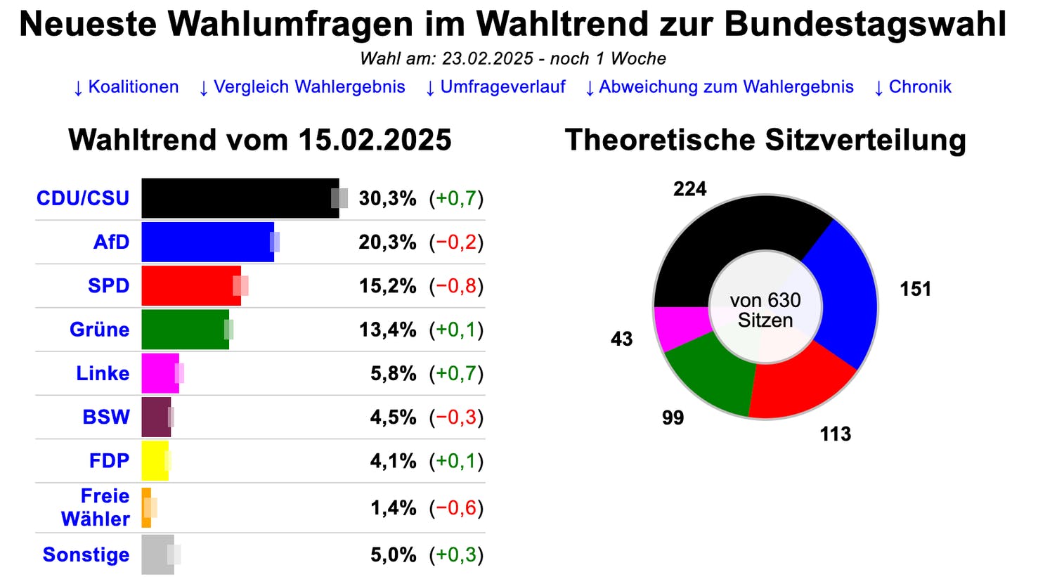 Laut der jüngsten Erhebung vom 15. Februar 2025 liegt die CDU/CSU mit 30,3 Prozent (+0,7) deutlich an der Spitze. Die AfD folgt mit 20,3 Prozent (-0,2) auf dem zweiten Platz. Die SPD muss sich mit 15,2 Prozent (-0,8) zufriedengeben und bleibt damit weiter im Abwärtstrend. Die Grünen stehen bei 13,4 Prozent (+0,1), während die Linke mit 5,8 Prozent (+0,7) leicht zulegen kann. An der 5-Prozent-Hürde würden demnach das neu gegründete Bündnis Sahra Wagenknecht (BSW) mit 4,5 Prozent (-0,3) und die FDP scheitern.