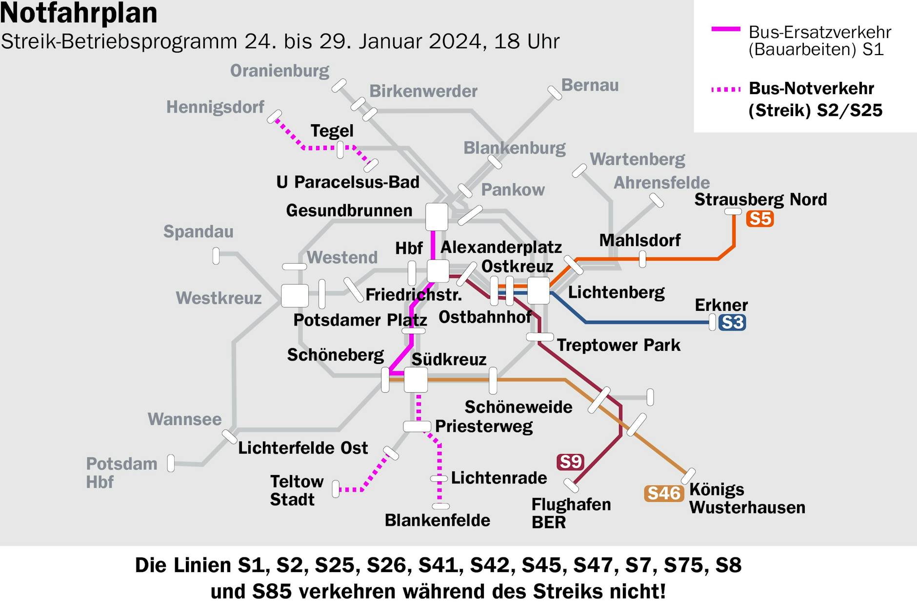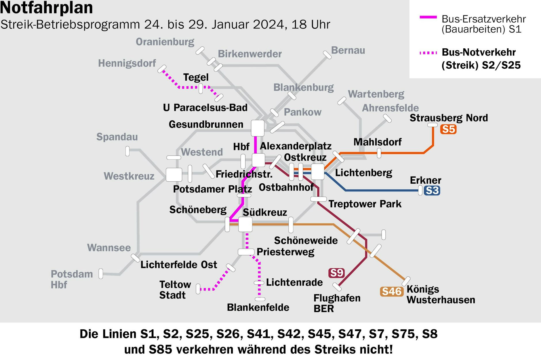 Der Schienenersatzverkehr für den S-Bahn-Tunnel in der Innenstadt, der bis Mitte Februar wegen Bauarbeiten gesperrt ist, bleibt während des Streiks im Einsatz. Der Bus S1A verbindet das Südkreuz mit dem Bahnhof Friedrichstraße. Dort gibt es Anschluss an den Bus S1B zum Bahnhof Gesundbrunnen. Wer weitere Strecken zurücklegen muss, sollte sich aber nach Alternativen umschauen – mit U6 und U8 geht es meist schneller.
