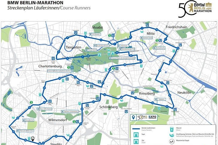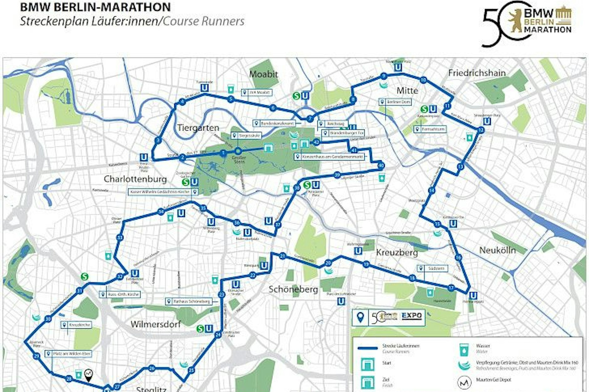 - Sonntag, 29. September 2024: Die Route der Läufer des Hauptfeldes führt ab 9.15 Uhr über die Straße des 17. Juni und den Ernst-Reuter-Platz nach Alt-Moabit, anschließend über Invalidenstraße, Torstraße und Karl-Marx-Allee zum Strausberger Platz. Richtung Süden geht es entlang der Lichtenberger Straße, Heinrich-Heine-Straße, Moritzplatz, Kottbusser Tor und Kottbusser Straße zum Hermannplatz in Neukölln, an der Hasenheide vorbei, Richtung Westen über Yorckstraße, Grunewaldstraße und Martin-Luther-Straße zum Rathaus Schöneberg. Über Friedenau und Schmargendorf führt die Strecke wieder stadteinwärts über den Hohenzollerndamm, Konstanzer Straße und Kurfürstendamm zum Wittenbergplatz. Zum Potsdamer Platz geht es dann über die Kleiststraße und Potsdamer Straße. Die letzten vier Kilometer führen entlang der Leipziger Straße zum Gendarmenmarkt und über die Straße Unter den Linden durch das Brandenburger Tor zum Ziel auf der Straße des 17. Juni. Die ersten Läufer im Ziel werden um 11.15 Uhr erwartet.