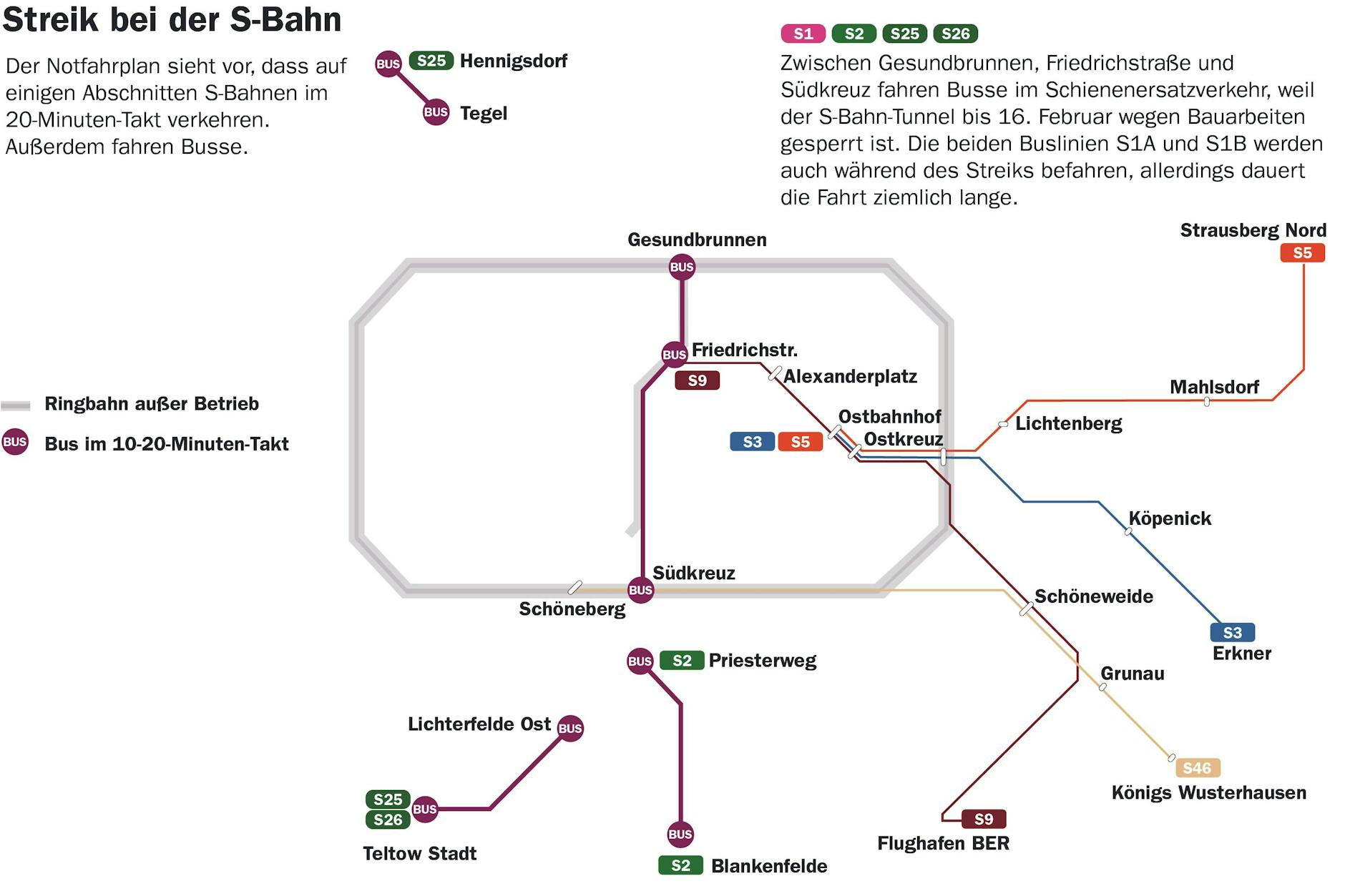 - Es kommt zu massiven Ausfällen und Einschränkungen im Nah- und Fernverkehr. Im Fernverkehr sollen bundesweit rund 20 Prozent der Züge im Notfahrplan fahren, auch für den Regionalverkehr und die S-Bahn Berlin gibt es Notfahrpläne.