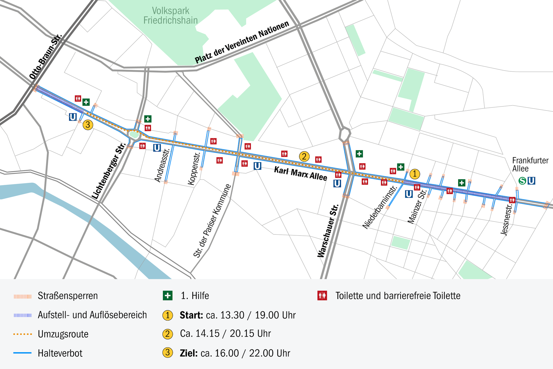 Am Sonntag werden Frankfurter Allee und Karl-Marx-Allee von 8 Uhr an komplett gesperrt. Dies gilt zunächst für den Abschnitt zwischen der Kreuzung Möllendorffstraße/Gürtelstraße und der Straße der Pariser Kommune. Von 9 Uhr an wird das Teilstück bis zur Kreuzung Otto-Braun-Straße/Alexanderstraße ebenfalls dichtgemacht.