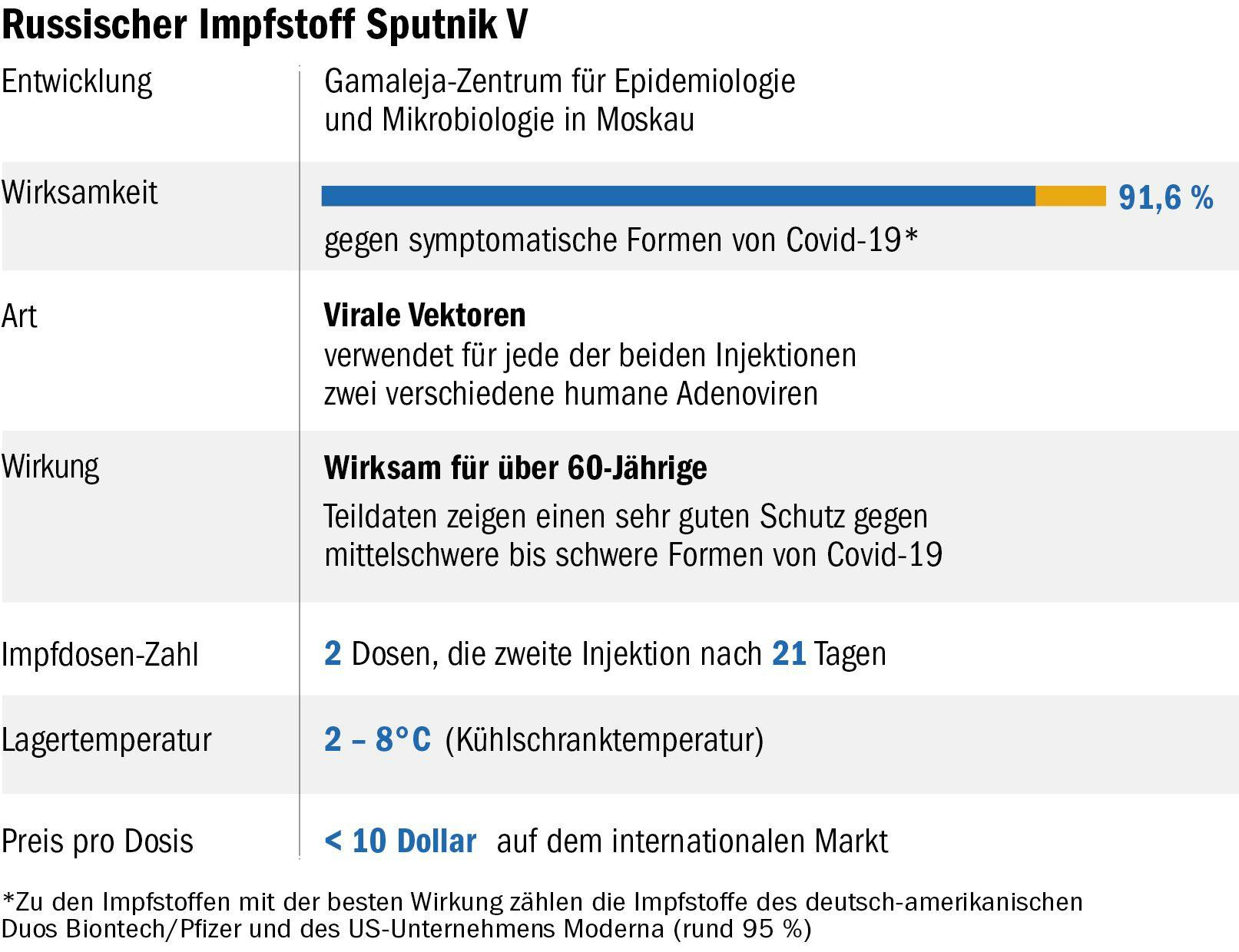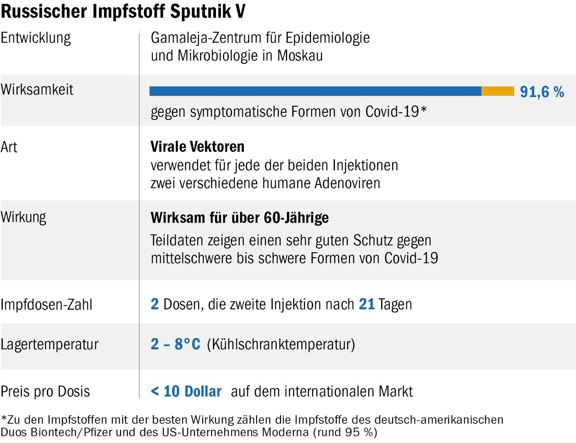 Nach einer Anfang Februar in der britischen Fachzeitschrift The Lancet veröffentlichten Studie schützt das Vakzin zu mehr als 90 Prozent vor einer symptomatischen Covid-19-Erkrankung. Damit hätte Sputnik V eine ähnlich hohe Wirksamkeit wie die Impfstoffe von Biontech/Pfizer und Moderna.
