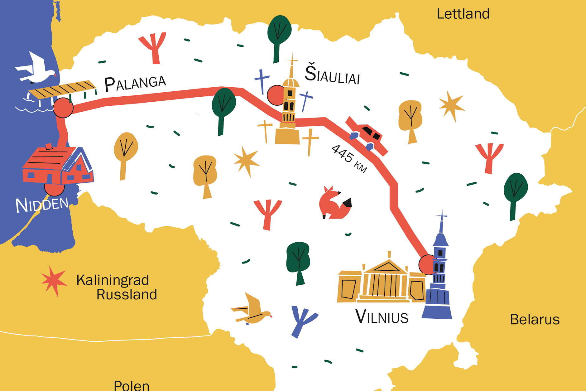 Hinter Palanga öffnet sich die Kurische Nehrung, ein schmaler Landstreifen zwischen Ostsee und Haff, der an seiner schmalsten Stelle nur wenige hundert Meter breit, aber dafür über 90 Kilometer lang ist. Eine Landschaft aus Licht, Sand und Wind, die zum Unesco-Welterbe gehört und zum Wandern über die Dünen einlädt. Die Nehrung war einst Teil des Memellandes, nach dem Ersten Weltkrieg kurzzeitig zu Litauen, dann wieder zu Deutschland gehörig.