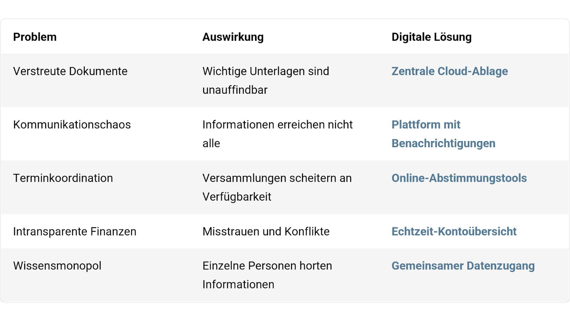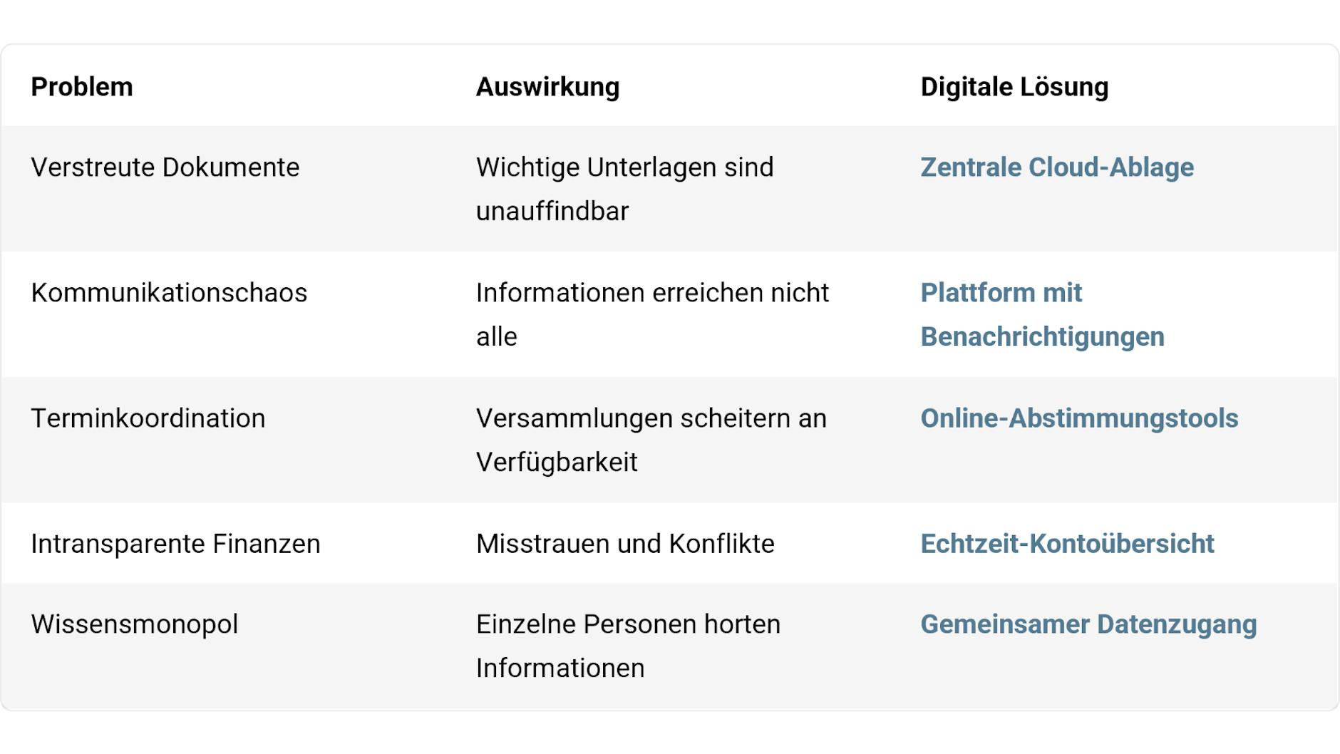 Für viele Gemeinschaften empfiehlt sich der Start mit der Dokumentenablage. Ein gemeinsamer Ordner in der Cloud, strukturiert nach Jahresabrechnungen, Protokollen, Verträgen und Korrespondenz, schafft sofort Mehrwert. Die Hürde ist niedrig, der Nutzen unmittelbar spürbar.