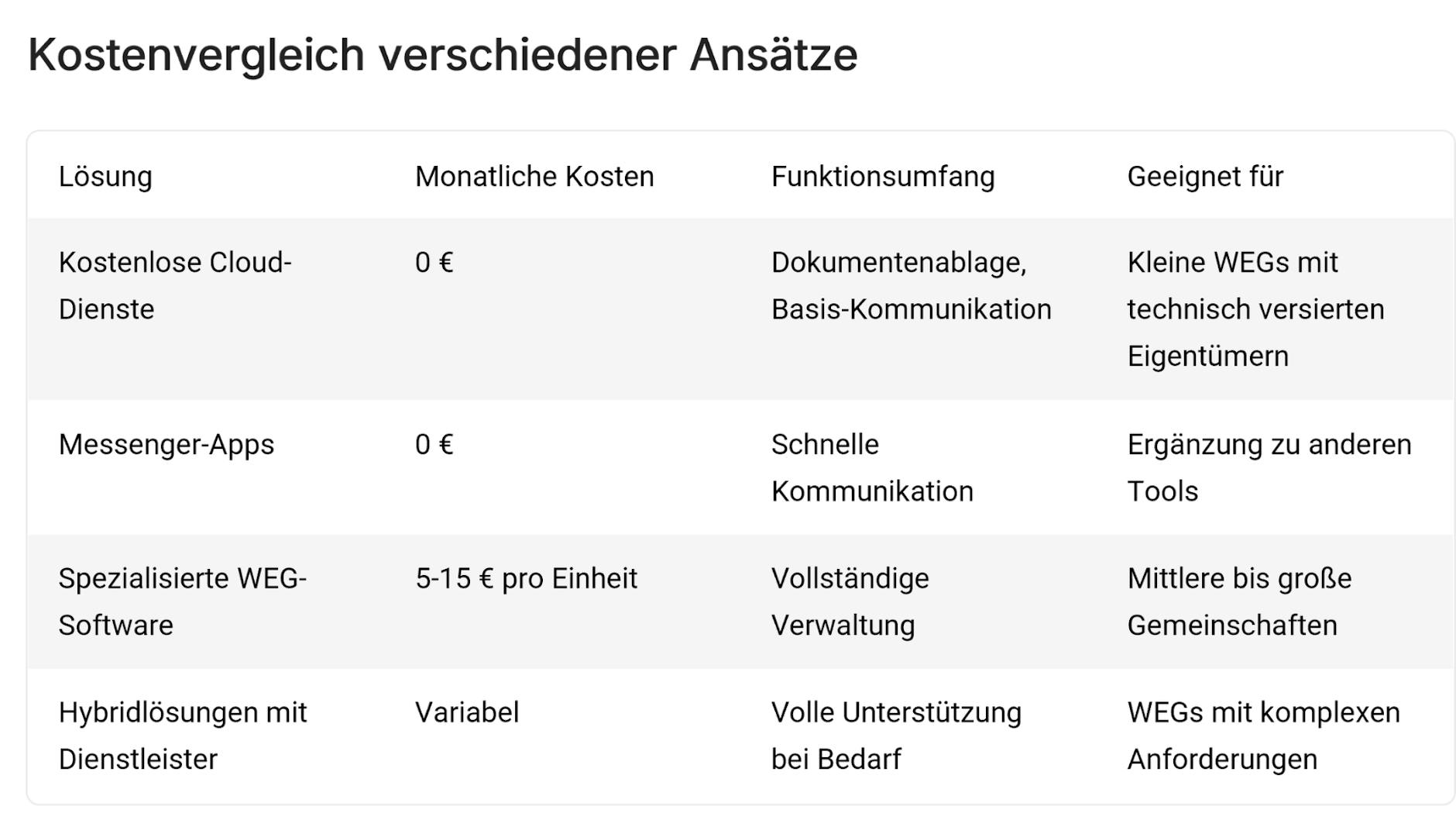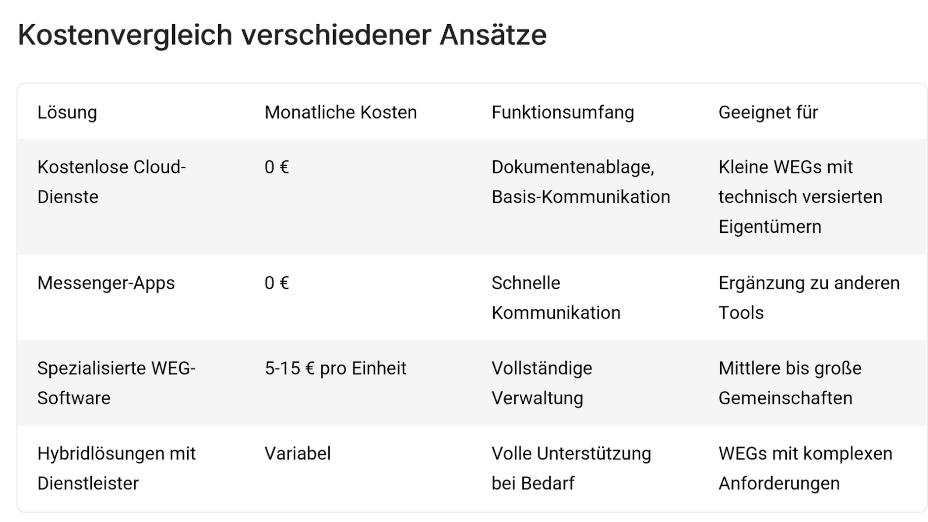 - Kostenlose und kostenpflichtige Tools decken unterschiedliche Bedürfnisse ab – von einfachen Cloud-Lösungen bis zu spezialisierten WEG-Plattformen