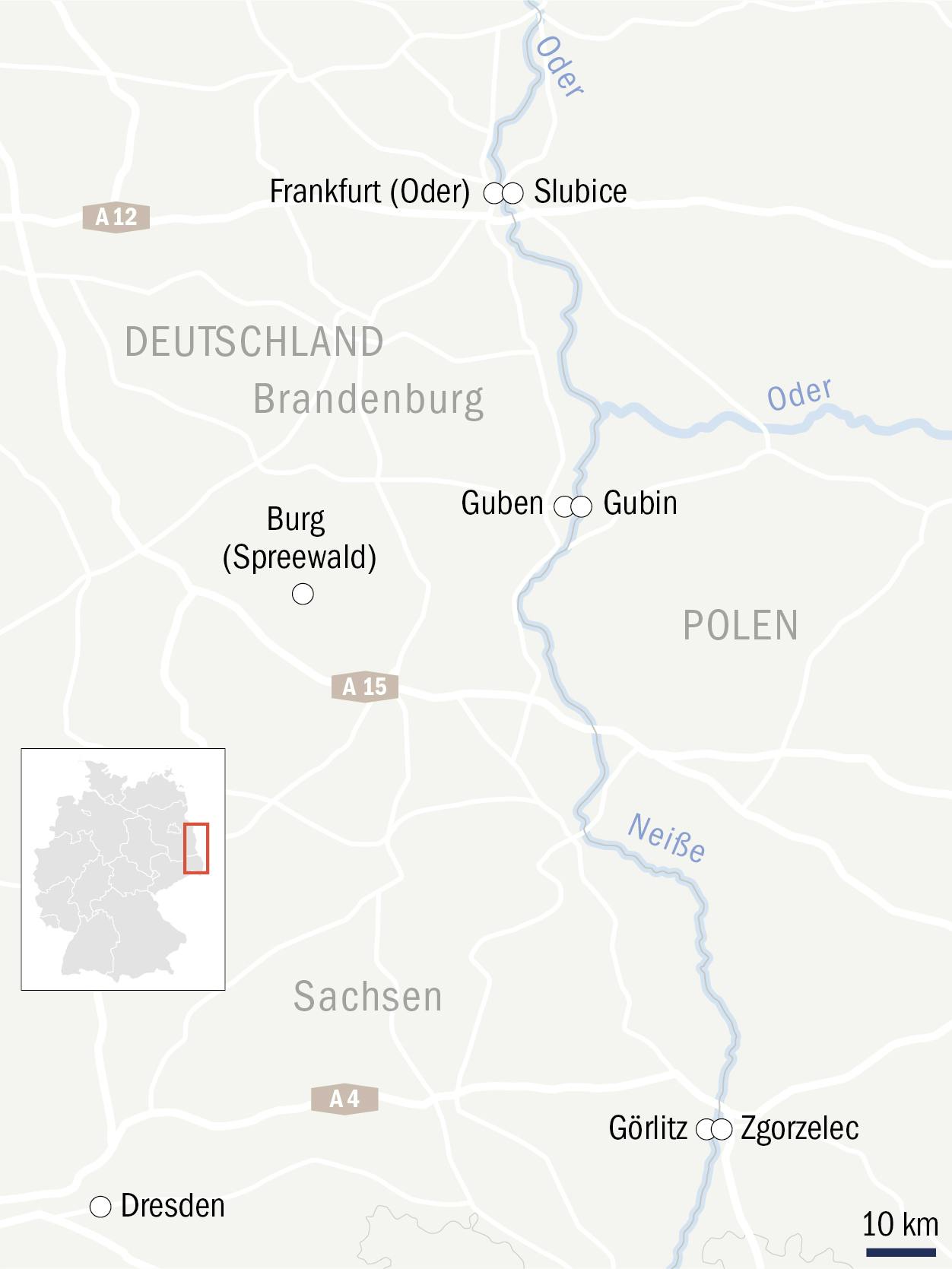 Weiter von Görlitz nach Guben, die sich schlängelnde Neiße entlang. Auch hier teilt der Fluss eine Stadt – in das deutsche Guben und das polnische Gubin. An der zentralen Grenzbrücke arbeitet ein polnischer Vermessungsingenieur am alljährlichen Monitoring des Wasserkraftwerks, das an der zentralen Brücke liegt. Es stammt noch aus deutscher Zeit, gehört heute zu Polen. „Entlang der Lausitzer Neiße gibt es viele solcher Kraftwerke“, sagt der Ingenieur, der nicht möchte, dass sein Name bekannt wird. Er lebt in Krakau, reist zu Dienstaufträgen an. Hier sei einiges anders als im Kernland seiner Heimat. „In dieser Region sieht man, dass die Leute von der Grenze abhängig sind – auf der polnischen Seite sind einige kleine Dörfer komplett auf den Austausch mit den Deutschen eingestellt: Zigaretten, Tankstellen, aber auch Veterinäre. Und an manchen Stellen gibt es nur Angaben in Euro.“ Und dann sagt er noch: „Hier in Gubin ist es aber anders.“