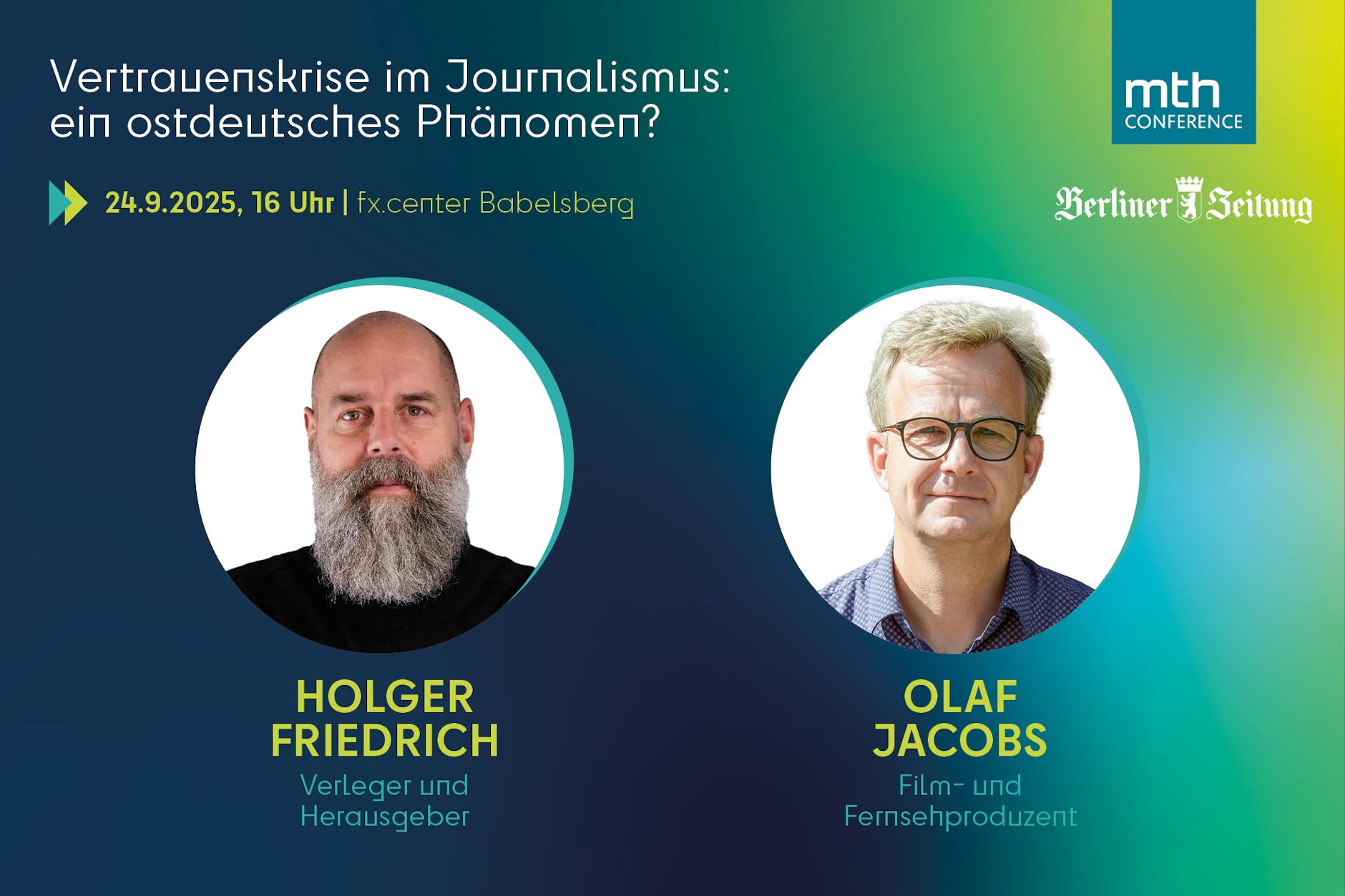 Über diese Fragen diskutiert Holger Friedrich, Verleger der Berliner Zeitung, mit Olaf Jacobs auf der MediaTech Hub Conference in Potsdam-Babelsberg. Jacobs ist Film- und Fernsehproduzent aus Berlin und Leipzig und hat als Beobachter der Szene mit der Produktion „Es ist kompliziert: Der Osten in den Medien“ 2025 für Aufsehen gesorgt. Die Diskussion wird moderiert von Peter Effenberg, Leiter der MediaTech Hub Conference. Die Öffentlichkeit ist zur Diskussion und kritischen Reflexion eingeladen – über die Frage, wie Medien Wirklichkeit formen und welche Rolle Herkunft, Perspektive und Machtstrukturen dabei spielen.