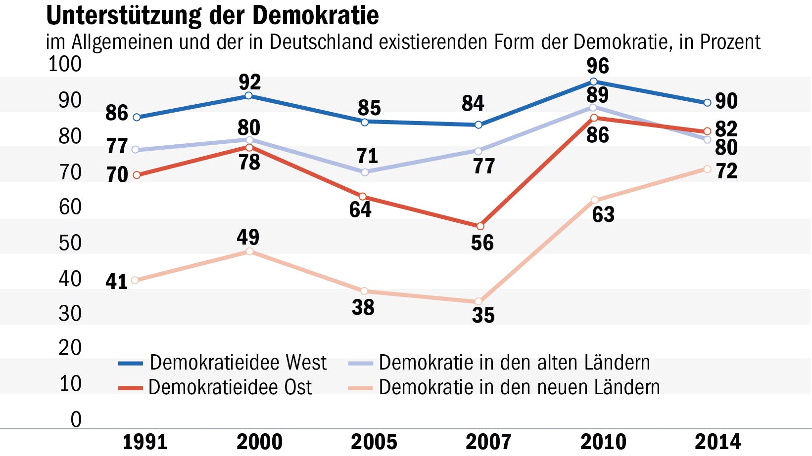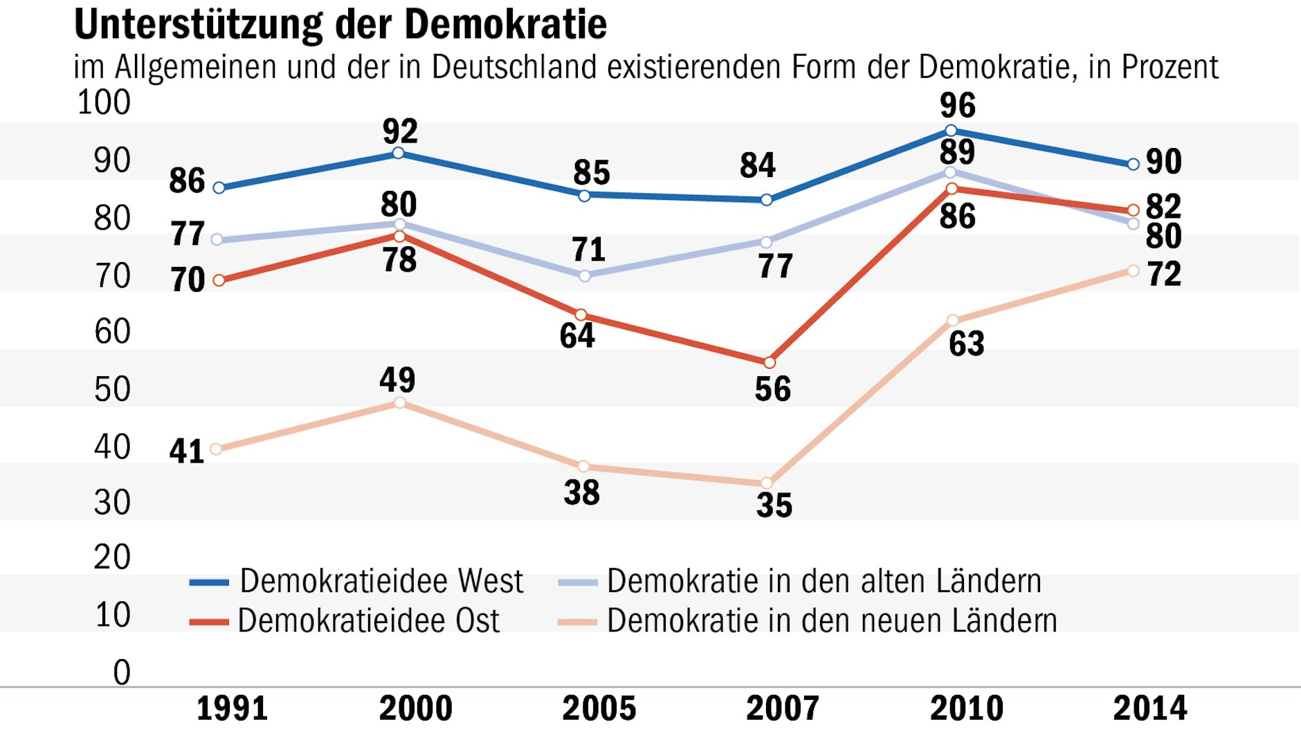 Zwar ist ein „nennenswerter Teil“ unzufriedener Bürger in der ganzen Republik nachweisbar, doch im Osten ist dieser stärker ausgeprägt. So wird das Vertrauen in die Institutionen Bundestag und Bundesregierung für Gesamtdeutschland als „gering ausgeprägt“ bezeichnet. Mit der aktuellen Bundesregierung sind 30 Prozent der Ostdeutschen absolut unzufrieden, bei den Westdeutschen sind es nur 18 Prozent. Die Zustimmung zur Demokratie als Staatsform für Deutschland liegt bundesweit bei 88 Prozent. Die Ostdeutschen stimmen zu 78 Prozent zu. 2007 lag die Zustimmung im Osten noch bei 56 Prozent.