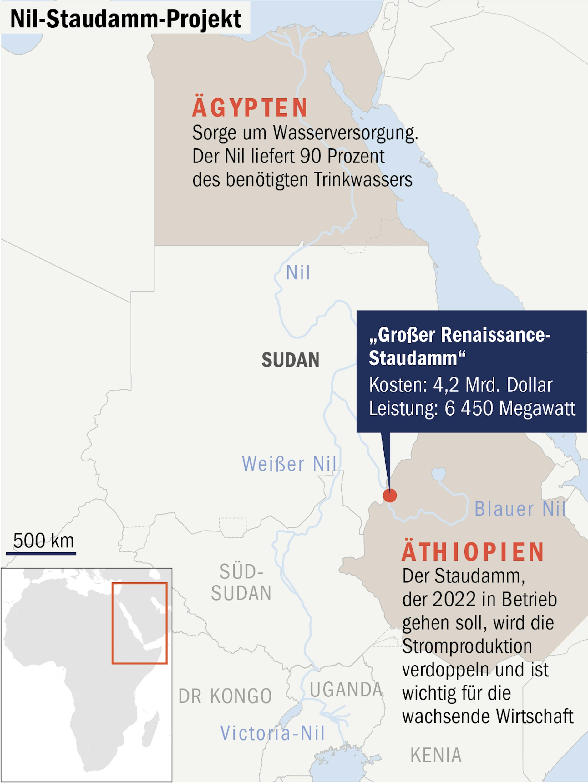 Addis Abeba-Rund 52.600 Millionen Kubikmeter Wasser fließen im Durchschnitt jährlich aus Äthiopiens Hochland den Blauen Nil runter. Äthiopien will die Fluten im künftig größten Staudamm Afrikas durch Turbinen jagen lassen. Für das Land ist der erzeugte Strom der Schlüssel zur wirtschaftlichen Entwicklung. Doch für Ägypten flussabwärts ist der Staudamm eine existenzielle Bedrohung. Der jahrelange Streit beider Länder um das Projekt hat nun einen vorläufigen Höhepunkt erreicht.
