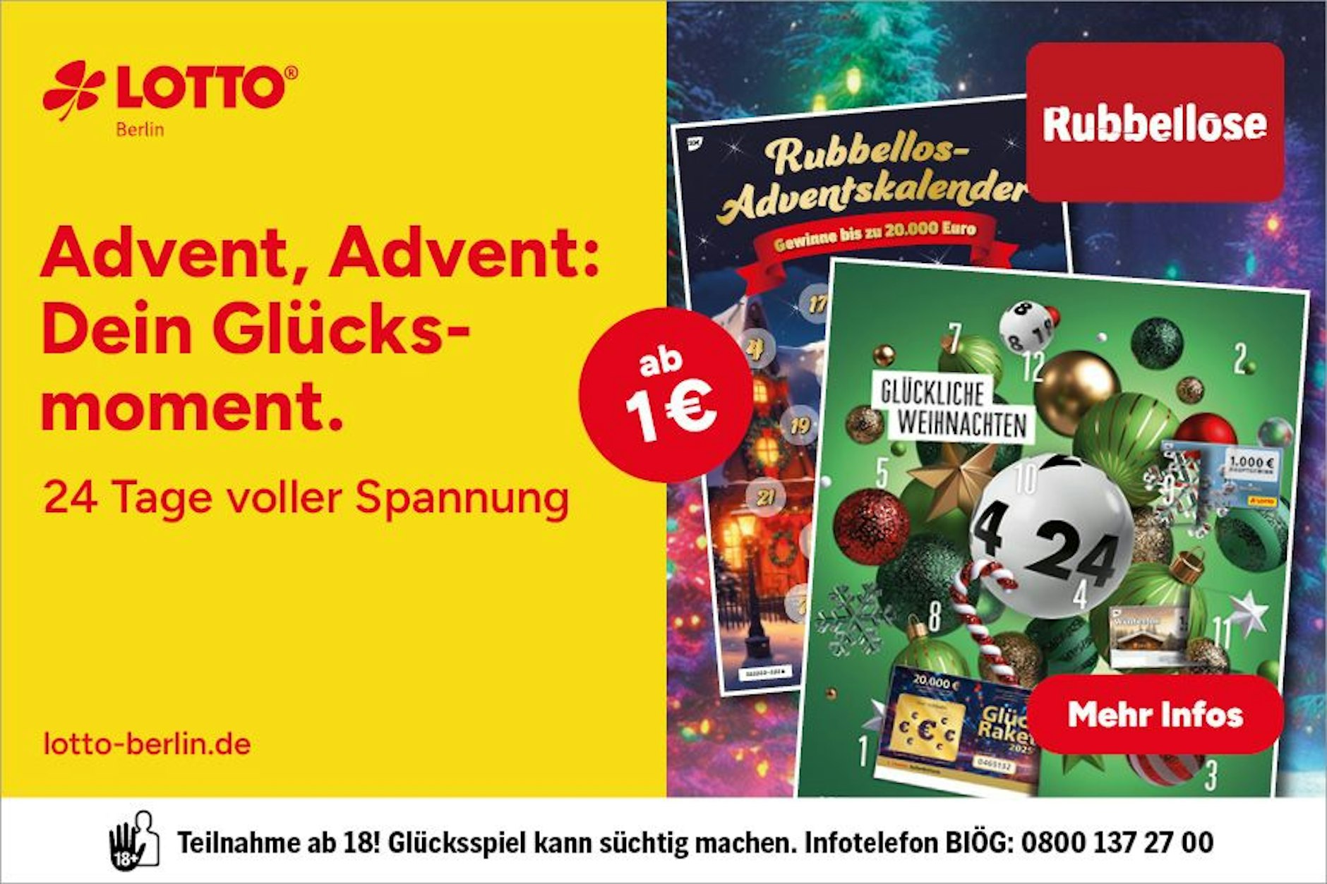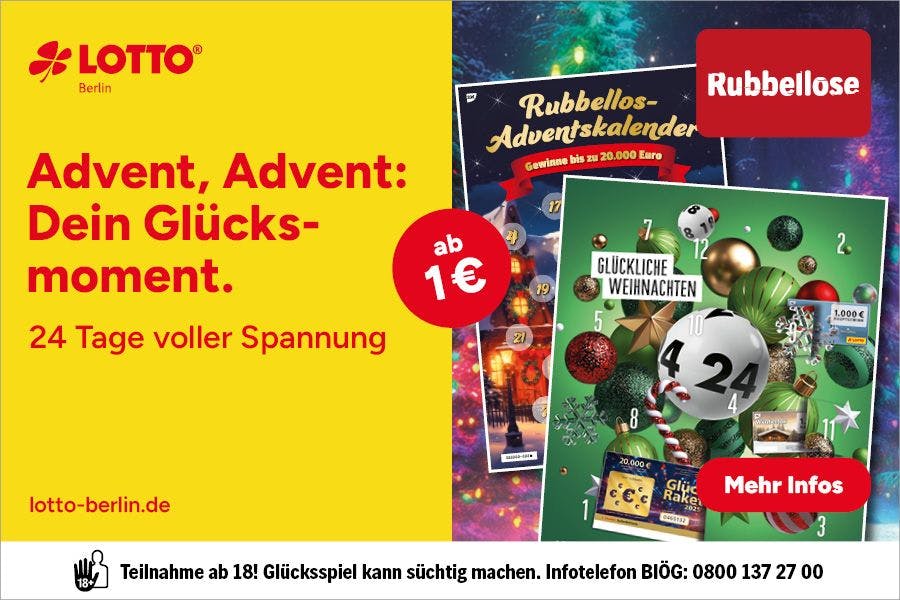 Für 20 € erhalten Sie in jedem Berliner LOTTO-Laden ein fertiges Adventskalender-Los. Ab dem 1. Dezember rubbeln Sie täglich ein Feld frei, sammeln Symbole und erfahren am 24., was Sie gewonnen haben. Von 5 € bis zu 20.000 € ist alles drin (Chance auf den Hauptgewinn: 1:40.000). Das Beste: Jedes Los gewinnt. Damit ist es ein ideales Mitbringsel zum Adventsbrunch, ein Geschenk für Partnerin oder Partner – oder einfach ein kleines Vergnügen für Sie selbst.