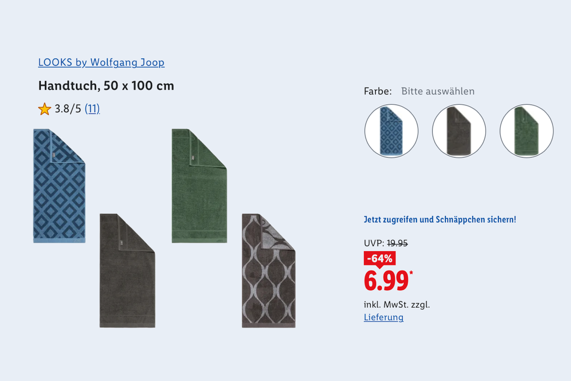 Exklusiver sind die Waren aus der Kollektion „Looks by Wolfgang Joop“, beispielsweise die hochwertigen Frottierhandtücher zum Sonderpreis von 6,99 €.