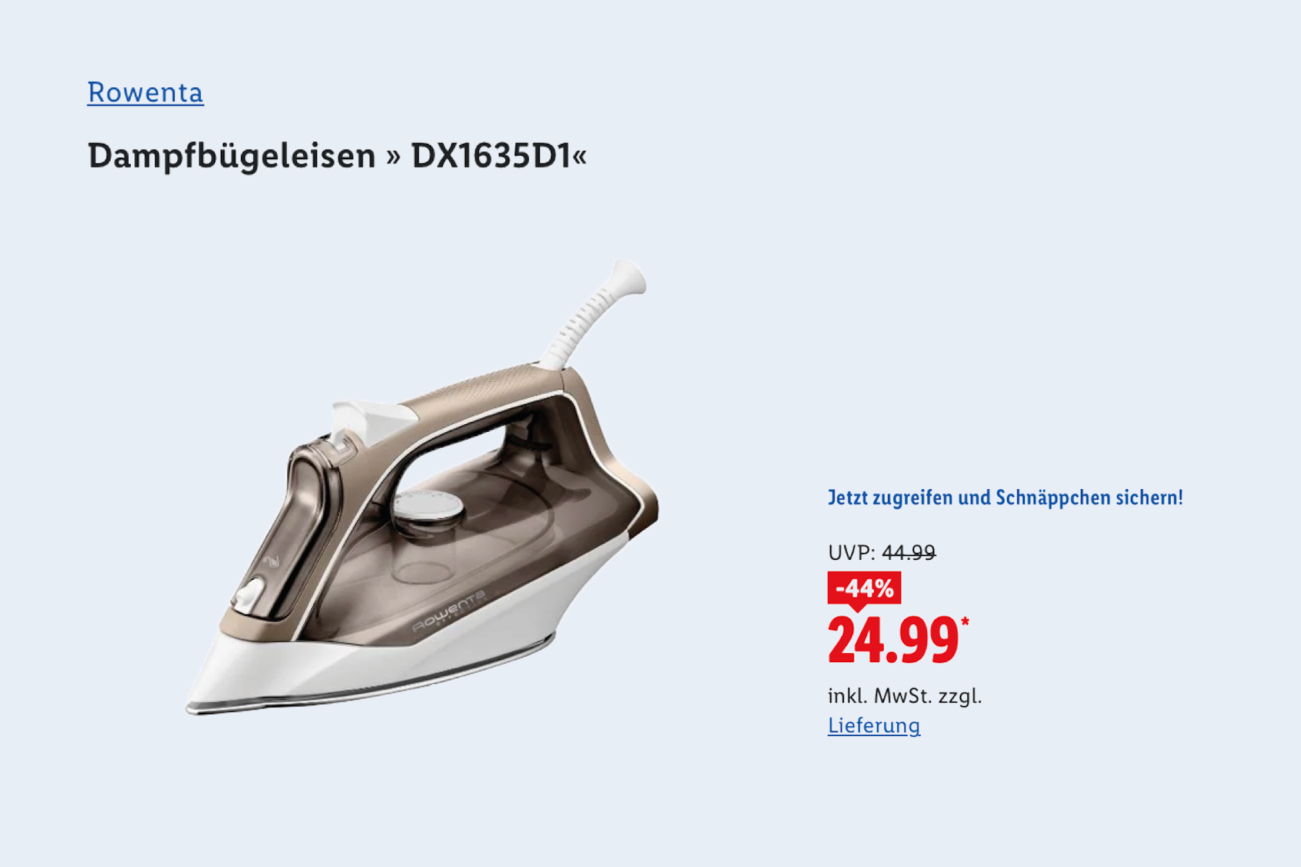 Direkt online shoppen lässt sich ein Megaschnäppchen. Das Rowenta Dampfbügeleisen ist in einem guten Haushalt unverzichtbar und um stolze 44 Prozent reduziert. Der Preis gilt auch ohne App. Wer etwas Praktisches und Langlebiges zu Weihnachten verschenken möchte, landet hiermit einen Volltreffer.