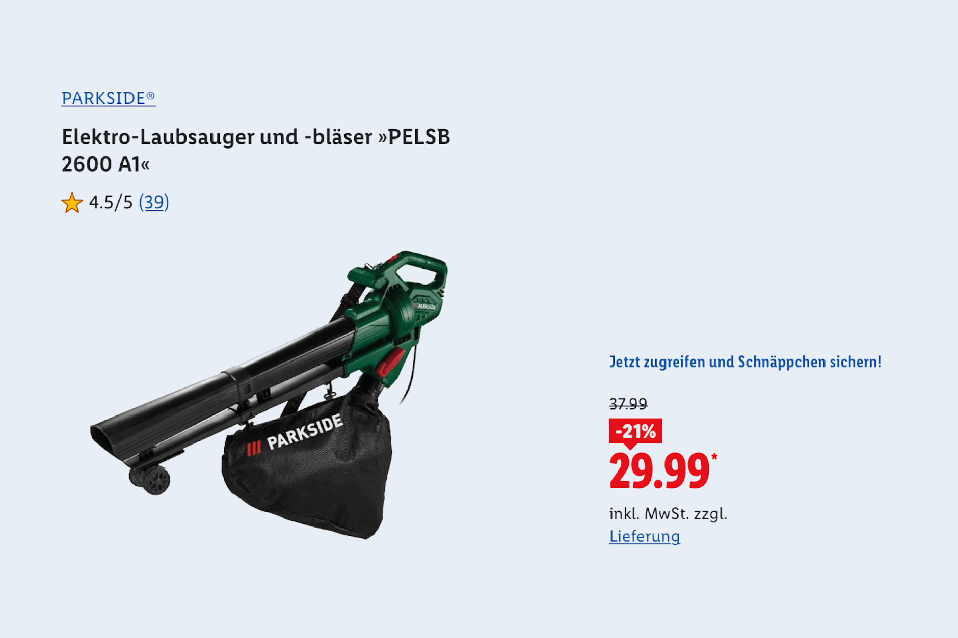 Genug gebastelt? Dann ruft vielleicht auch am Wochenende ein wenig die Pflicht. Mit dem Elektro-Laubsauger und -bläser werden die Wege schon für 29,99 € frei. Ein echtes Schnäppchen mit verstellbarem Saugrohr und praktischem Umschnallgurt.