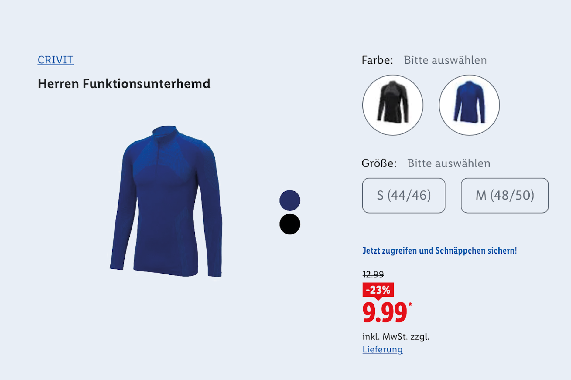 Für wohlige Wärme sorgt das Funktionsunterhemd in verschiedenen Farben, das auch nur 9,99 € kostet.