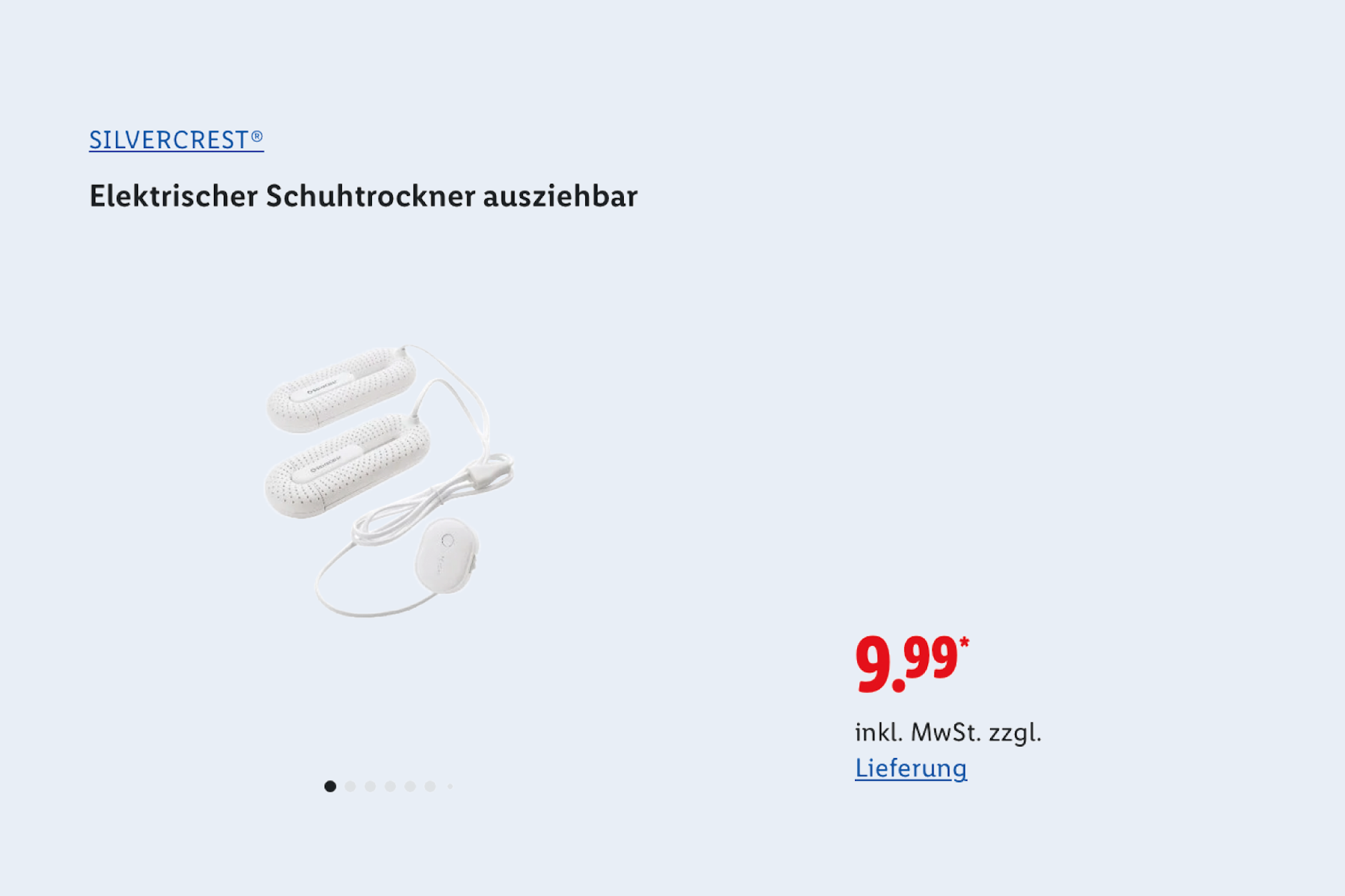 Wer auch an nasskalten Herbsttagen gerne spazieren geht, braucht wetterfeste Kleidung oder wahlweise den ausziehbaren elektrischen Schuhtrockner für 9,99 €. Einfach in die Schuhe legen, einschalten und nach kurzer Trockenzeit kann es weitergehen.