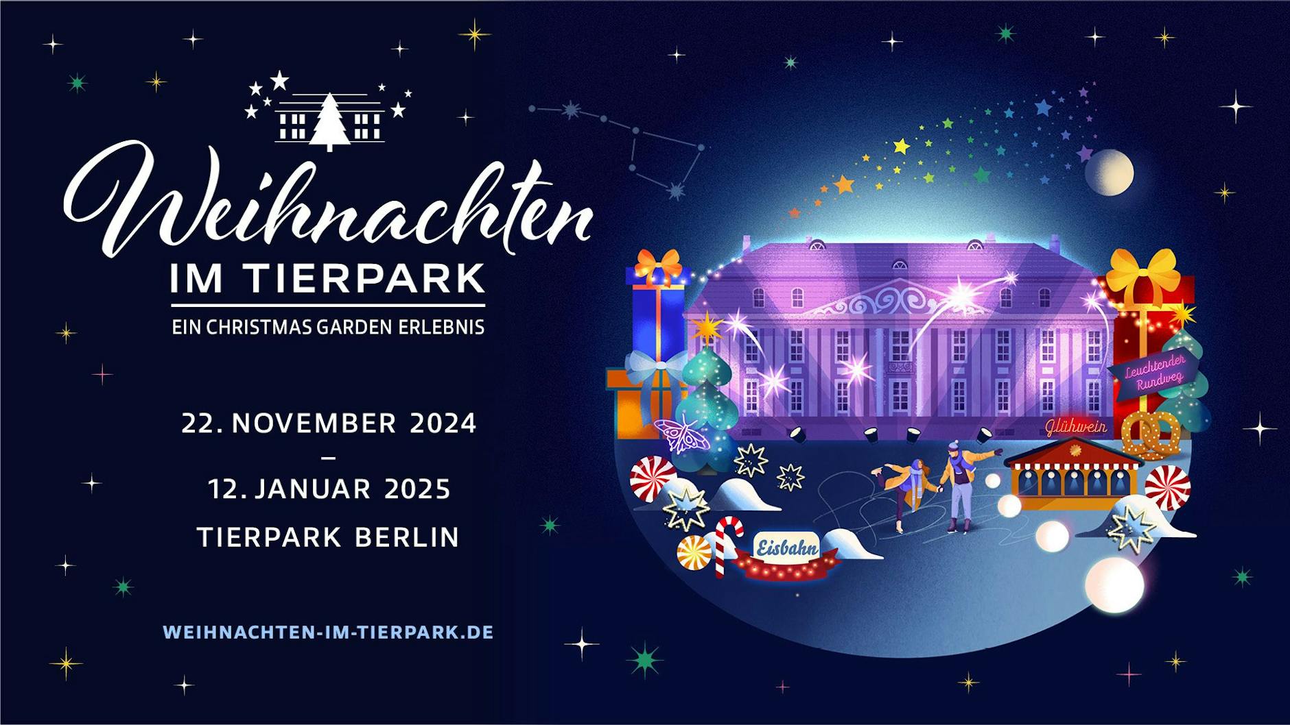 Weihnachten ist das Knuspern von gebrannten Mandeln auf dem Weihnachtsmarkt, der Geruch von Glühwein, Tannennadeln und frisch gebackenen Plätzchen und der magische Spaziergang durch den liebevoll erleuchteten Tierpark Berlin. Weihnachten im Tierpark hat sich in den vergangenen Jahren zu einer beliebten Tradition entwickelt: Vom 22. November 2024 bis zum 12. Januar 2025 verwandelt sich der Tierpark mit Anbruch der Dämmerung in ein besinnlich leuchtendes Lichterspektakel, das die Besucher:innen auf eine vorweihnachtliche Entdeckungsreise durch die farbenfroh beleuchtete Parkanlage geleitet. Auch in diesem Jahr dürfen sich die Besucher:innen wieder auf einen etwa zwei Kilometer lange Rundweg mit festlichen Illuminationen und kreativen Installationen freuen.