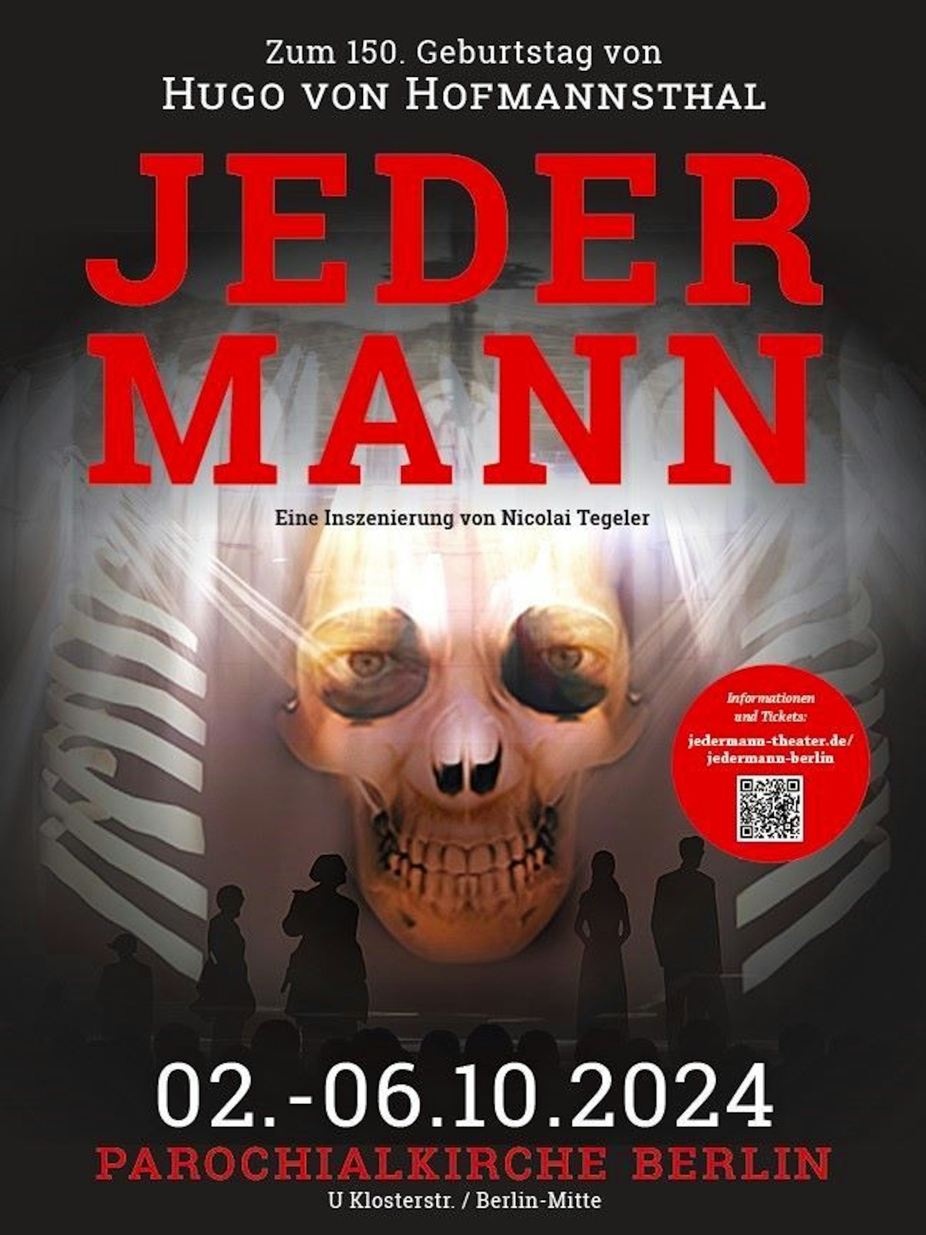 Tickets für den JEDERMANN in der Parochialkirche Berlin Mitte vom 02.10.2024 – 06.10.2024 sowie Infos zur Inszenierung erhalten Sie hier. Im Drama von Hugo von Hofmannsthal spielt 2024 Julian Weigend den JEDERMANN. Buchen Sie direkt hier online oder rufen Sie uns an unter 030 2327 7500 (Mo-Fr: 9-17 Uhr).